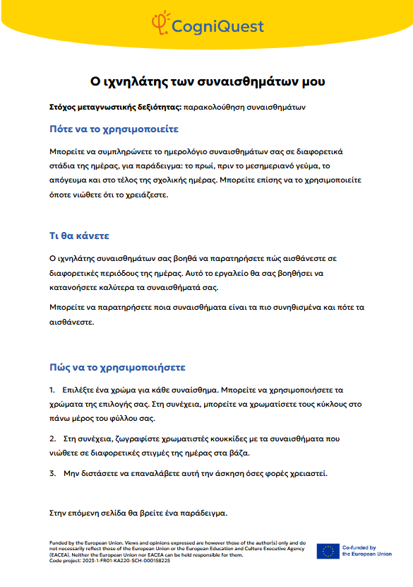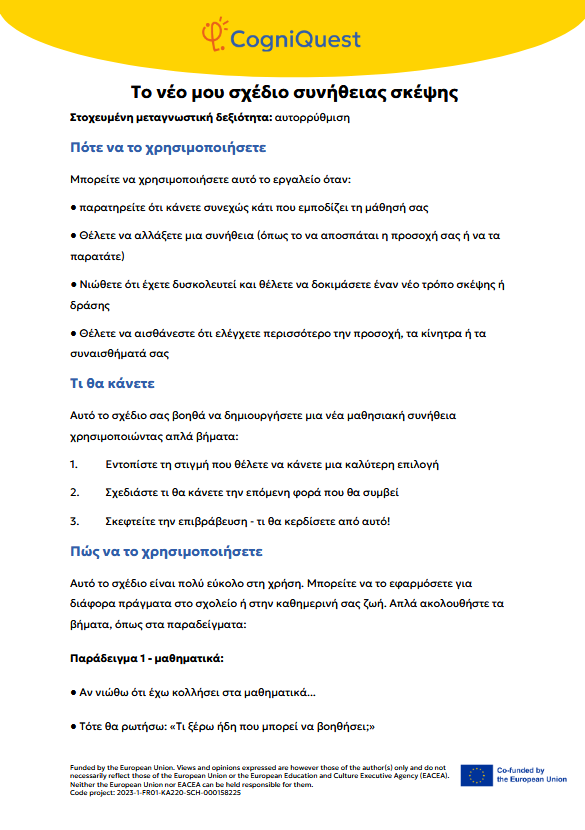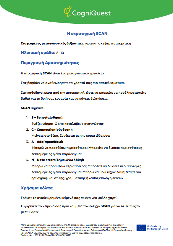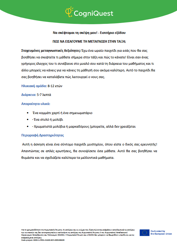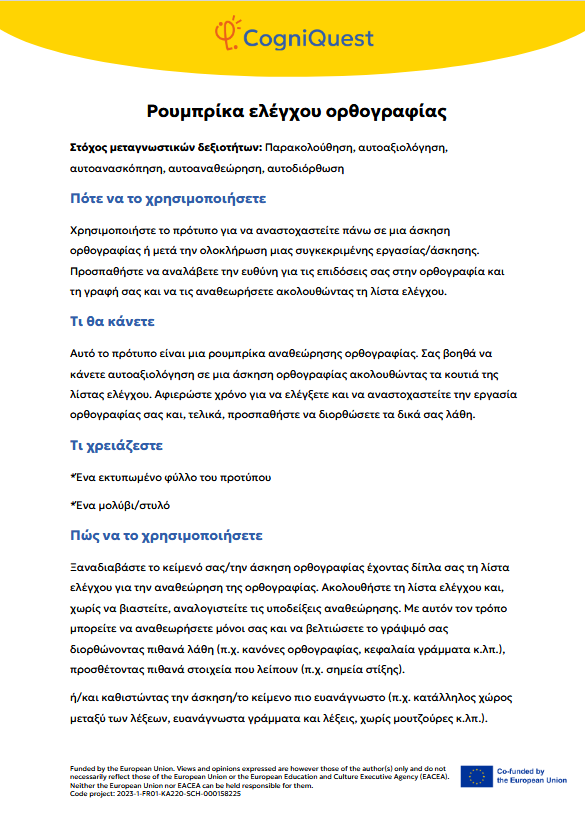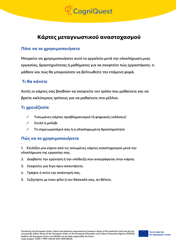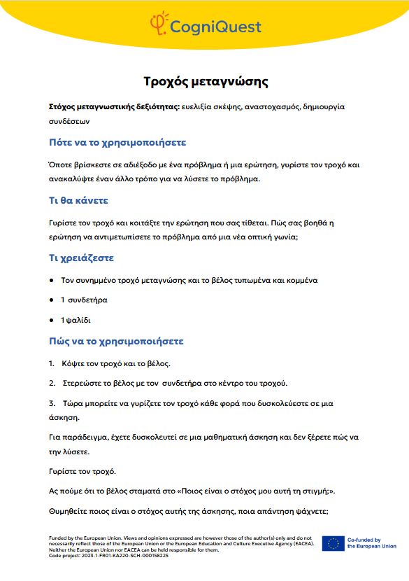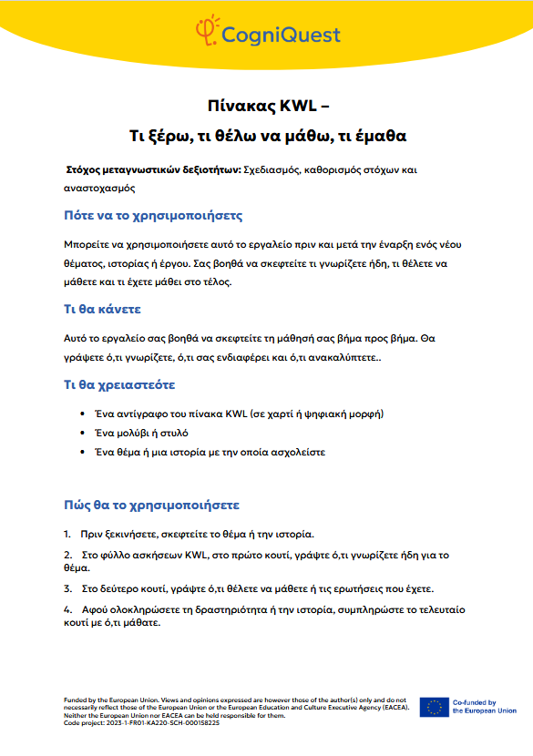 Εξερεύνησε Διηγήματα για να μάθεις να μαθαίνεις Τα φτερά του ΙκάρουΤο κάλεσμα των ΣειρήνωνΤο μυστικό κλειδίΟ γρίφος του χαμένου κλειδιούΤο μυστήριο του εξαφανισμένου τρόπαιουΟ μυστηριώδης χάρτηςΟ λαβύρινθος των αναμνήσεωνΤο κρυμμένο μήνυμαΗ Άρπα της ΑλήθειαςΟ καθρέφτης του Μορφέα Όλα τα διηγήματα Σκέψου Τι είναι η Μεταγνώση;Τα μυστικά της σκέψης και της μάθησής σουΓίνε εξερευνητής της σκέψης!Μεταγνώση και στυλ μάθησης Παιχνίδι με κάρτες Λύσε Να σκέφτομαι τη σκέψη μου! – Εισιτήριο εξόδουΟ εννοιολογικός μου χάρτης: Πώς μαθαίνω καλύτερα;ΣΧΕΔΙΑΣΕ & ΓΡΑΨΕ: Η ισχυρή στρατηγική σας για το κείμενοΤο πιο θολό σημείοΣκέψη με φωτεινούς σηματοδότες: Σκεφτείτε – ΑπαντήστεΗ στρατηγική SCANΗ τεχνική FeynmanΚουίζ για να γνωρίσω τον εαυτό μου λίγο περισσότεροΗ στρατηγική «ASCQ»Aναθεώρηση γραπτού κειμένου σε δύο επίπεδα Όλες οι ασκήσεις Apply Το σούπερ μυαλό μου – Πώς να το ενισχύσω;Το κεφάλι μου σκέφτεται! – Πώς μαθαίνω και τι με βοηθάει;Πίνακας KWL – Τι ξέρω, τι θέλω να μάθω, τι έμαθαΚάρτες μεταγνωστικού αναστοχασμούΒαρόμετρο προσοχήςΟ ιχνηλάτης των συναισθημάτων μουΤροχός μεταγνώσηςΤο νέο μου σχέδιο συνήθειας σκέψηςΦύλλο καθορισμού στόχων για παιδιάΡουμπρίκα ελέγχου ορθογραφίας All tools