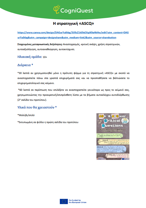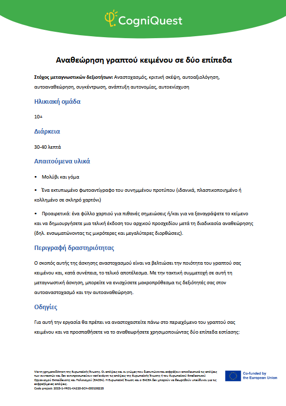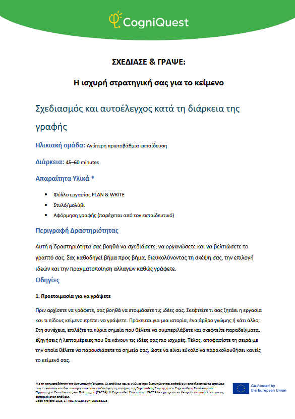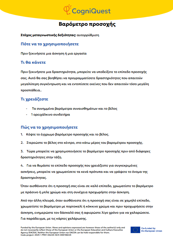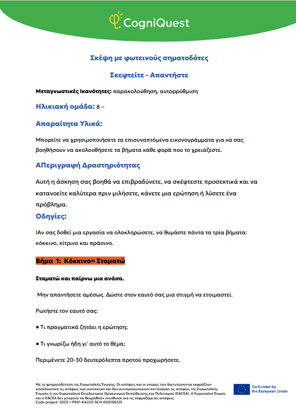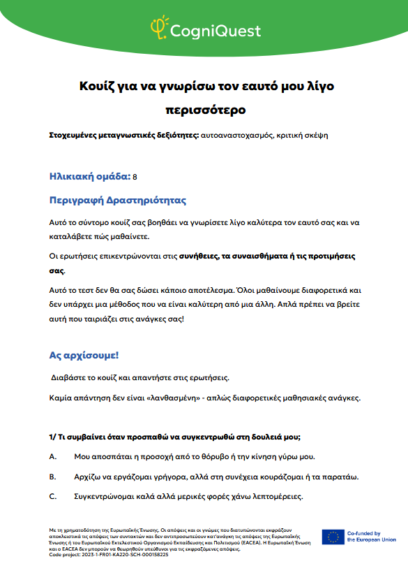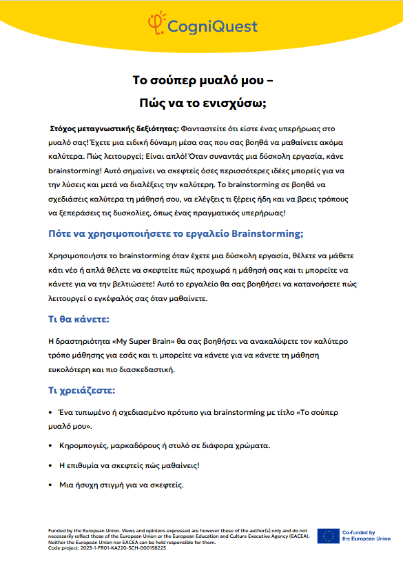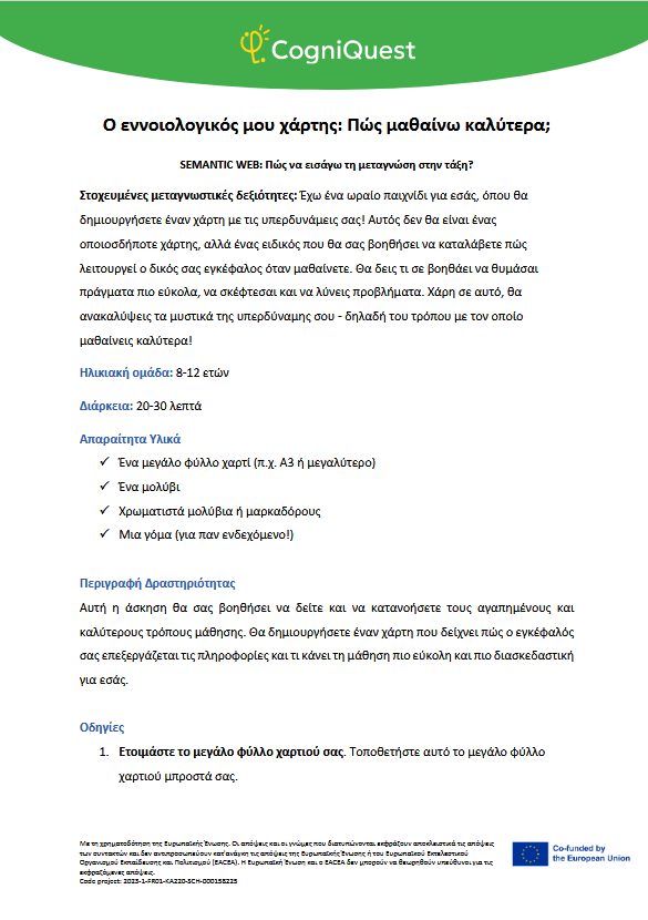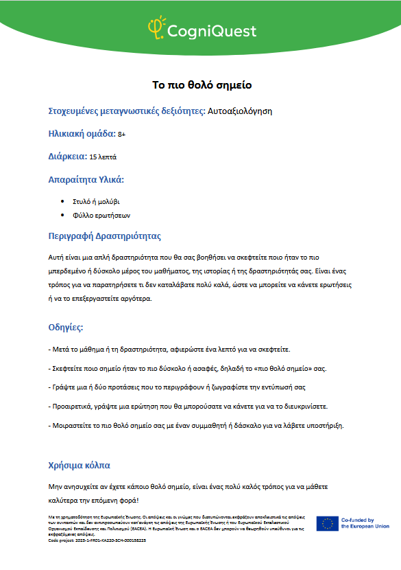Εξερεύνησε Διηγήματα για να μάθεις να μαθαίνεις Τα φτερά του ΙκάρουΤο κάλεσμα των ΣειρήνωνΤο μυστικό κλειδίΟ γρίφος του χαμένου κλειδιούΤο μυστήριο του εξαφανισμένου τρόπαιουΟ μυστηριώδης χάρτηςΟ λαβύρινθος των αναμνήσεωνΤο κρυμμένο μήνυμαΗ Άρπα της ΑλήθειαςΟ καθρέφτης του Μορφέα Όλα τα διηγήματα Σκέψου Τι είναι η Μεταγνώση;Τα μυστικά της σκέψης και της μάθησής σουΓίνε εξερευνητής της σκέψης!Μεταγνώση και στυλ μάθησης Παιχνίδι με κάρτες Λύσε Να σκέφτομαι τη σκέψη μου! – Εισιτήριο εξόδουΟ εννοιολογικός μου χάρτης: Πώς μαθαίνω καλύτερα;ΣΧΕΔΙΑΣΕ & ΓΡΑΨΕ: Η ισχυρή στρατηγική σας για το κείμενοΤο πιο θολό σημείοΣκέψη με φωτεινούς σηματοδότες: Σκεφτείτε – ΑπαντήστεΗ στρατηγική SCANΗ τεχνική FeynmanΚουίζ για να γνωρίσω τον εαυτό μου λίγο περισσότεροΗ στρατηγική «ASCQ»Aναθεώρηση γραπτού κειμένου σε δύο επίπεδα Όλες οι ασκήσεις Apply Το σούπερ μυαλό μου – Πώς να το ενισχύσω;Το κεφάλι μου σκέφτεται! – Πώς μαθαίνω και τι με βοηθάει;Πίνακας KWL – Τι ξέρω, τι θέλω να μάθω, τι έμαθαΚάρτες μεταγνωστικού αναστοχασμούΒαρόμετρο προσοχήςΟ ιχνηλάτης των συναισθημάτων μουΤροχός μεταγνώσηςΤο νέο μου σχέδιο συνήθειας σκέψηςΦύλλο καθορισμού στόχων για παιδιάΡουμπρίκα ελέγχου ορθογραφίας All tools