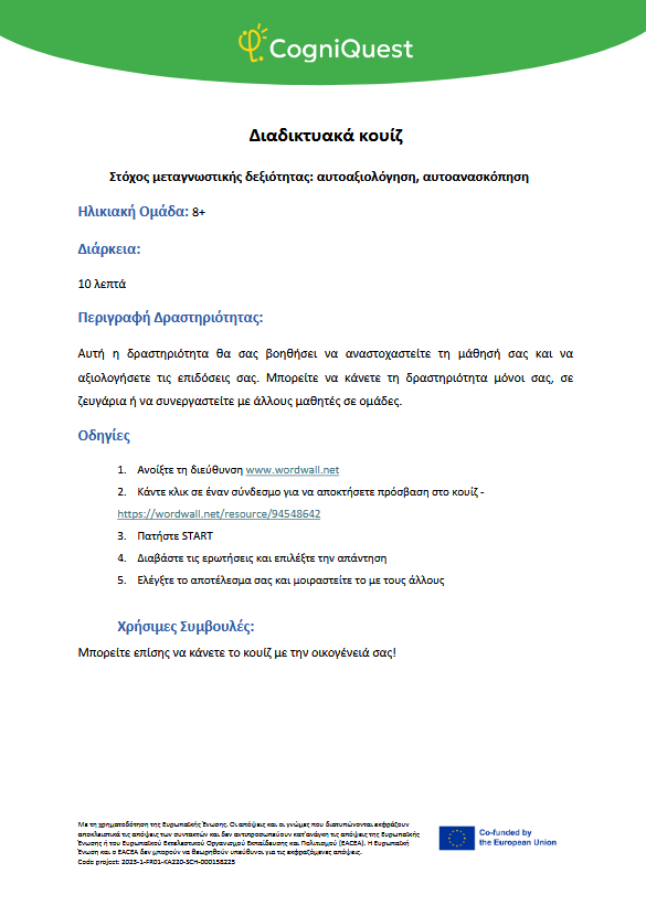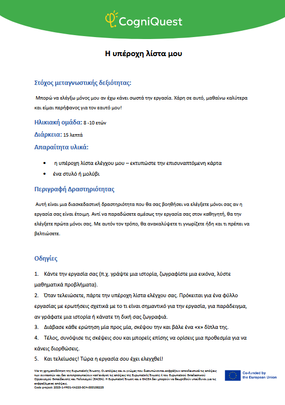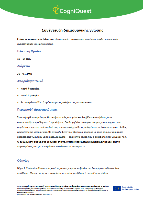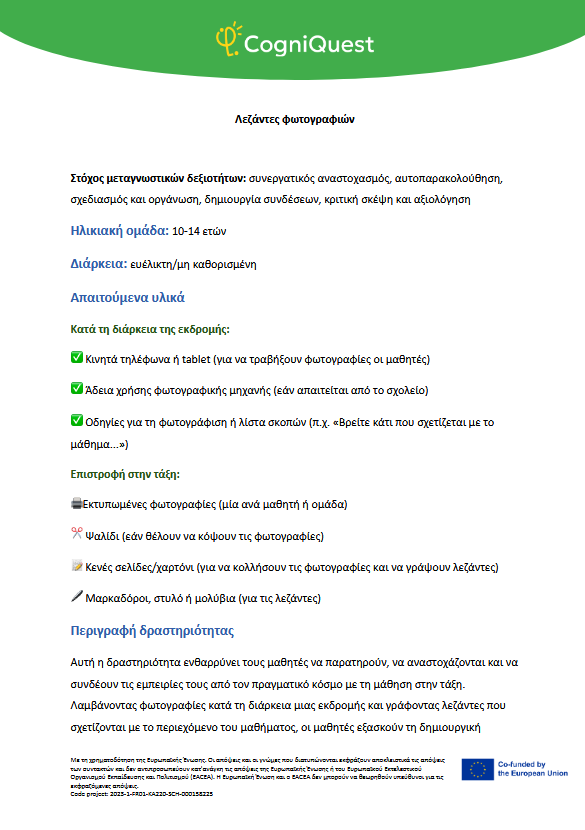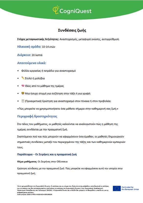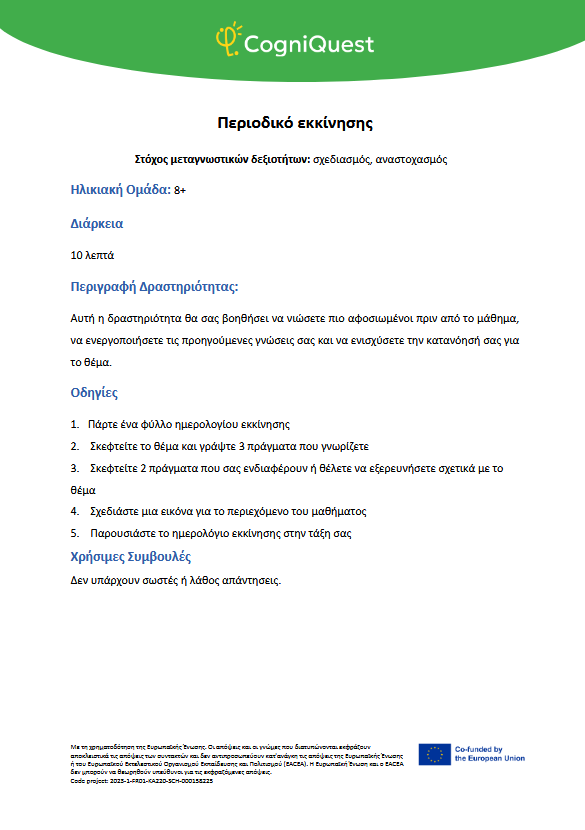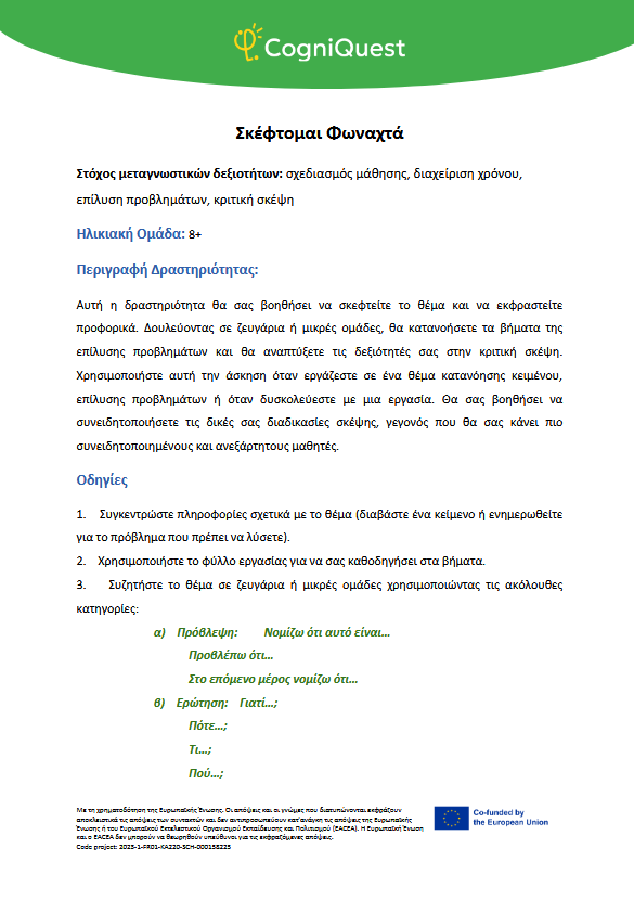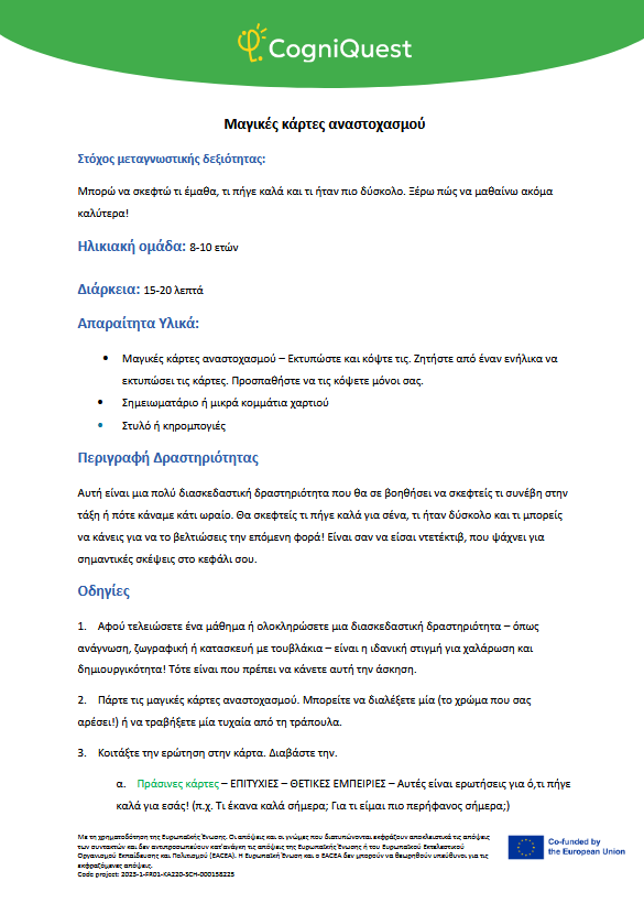 Λύσε Να σκέφτομαι τη σκέψη μου! – Εισιτήριο εξόδουΟ εννοιολογικός μου χάρτης: Πώς μαθαίνω καλύτερα;ΣΧΕΔΙΑΣΕ & ΓΡΑΨΕ: Η ισχυρή στρατηγική σας για το κείμενοΤο πιο θολό σημείοΣκέψη με φωτεινούς σηματοδότες: Σκεφτείτε – ΑπαντήστεΗ στρατηγική SCANΗ τεχνική FeynmanΚουίζ για να γνωρίσω τον εαυτό μου λίγο περισσότεροΗ στρατηγική «ASCQ»Aναθεώρηση γραπτού κειμένου σε δύο επίπεδαΑξιολόγηση από ομότιμουςΥπέροχη ομάδα επιχειρημάτων!Θα προτιμούσες;Πάσα με μπάλαΗ υπέροχη λίστα μουΜαγικές κάρτες αναστοχασμούΜεταγνωστικές « παύσεις »Η τεχνική των μίνι projectsΆσκηση ανίχνευσης συναισθημάτωνΔραστηριότητα με κάρτες χαλάρωσηςΔεξαμενή ενέργειαςΗμερολόγια μάθησης ή ημερολόγια αναστοχασμούΣυνέντευξη δημιουργικής γνώσηςΕπιστολές προς τους μελλοντικούς μαθητέςΣημειώσεις από τις κάρτες ευρετηρίουΣκέφτομαι ΦωναχτάΣυνδέσεις ζωήςΛεζάντες φωτογραφιώνΠεριοδικό εκκίνησηςΔιαδικτυακά κουίζ