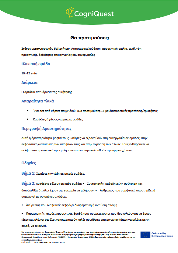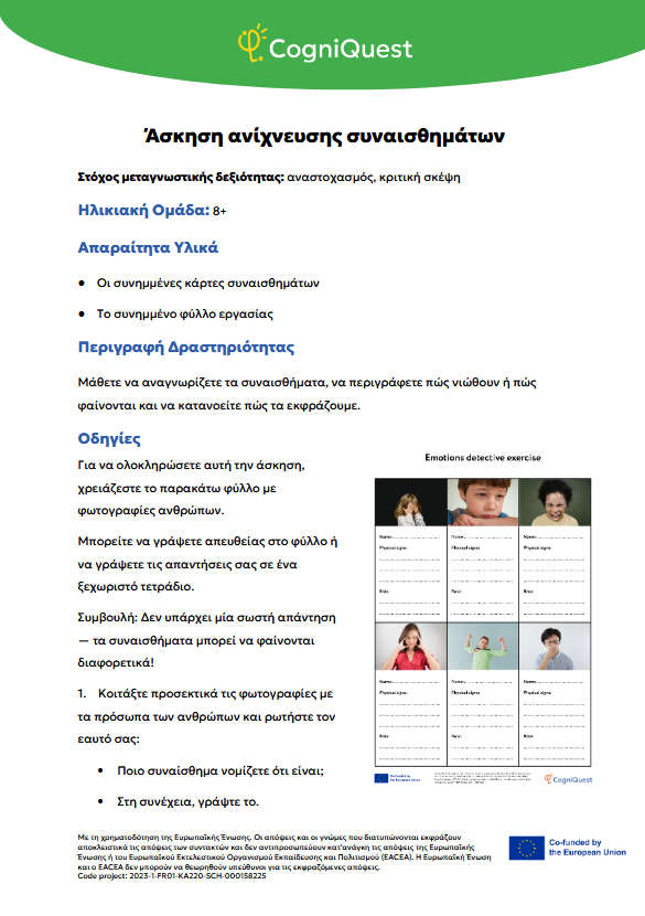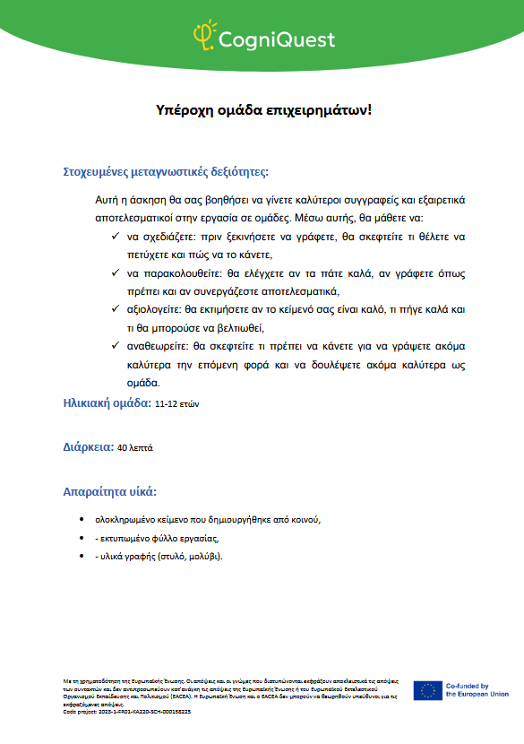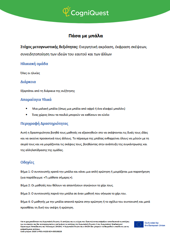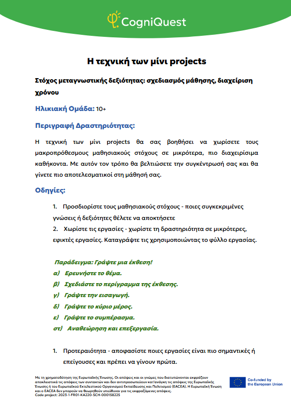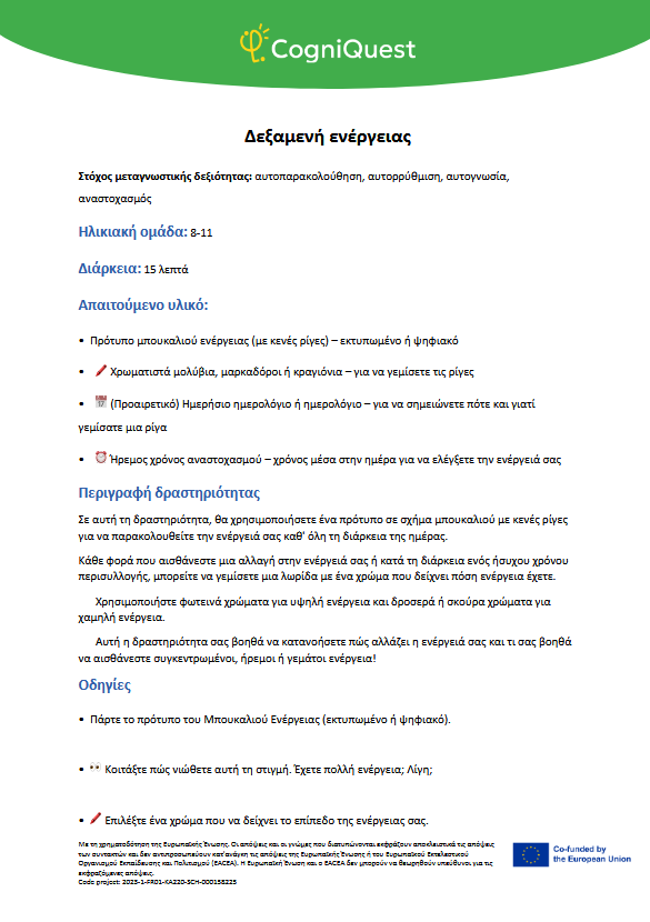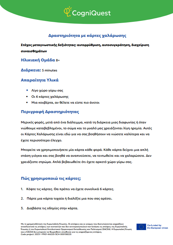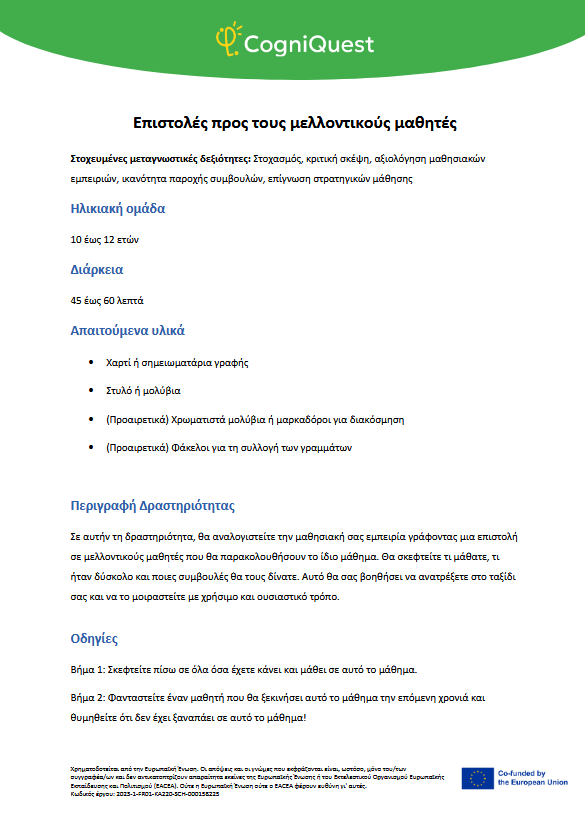 Λύσε Να σκέφτομαι τη σκέψη μου! – Εισιτήριο εξόδουΟ εννοιολογικός μου χάρτης: Πώς μαθαίνω καλύτερα;ΣΧΕΔΙΑΣΕ & ΓΡΑΨΕ: Η ισχυρή στρατηγική σας για το κείμενοΤο πιο θολό σημείοΣκέψη με φωτεινούς σηματοδότες: Σκεφτείτε – ΑπαντήστεΗ στρατηγική SCANΗ τεχνική FeynmanΚουίζ για να γνωρίσω τον εαυτό μου λίγο περισσότεροΗ στρατηγική «ASCQ»Aναθεώρηση γραπτού κειμένου σε δύο επίπεδαΑξιολόγηση από ομότιμουςΥπέροχη ομάδα επιχειρημάτων!Θα προτιμούσες;Πάσα με μπάλαΗ υπέροχη λίστα μουΜαγικές κάρτες αναστοχασμούΜεταγνωστικές « παύσεις »Η τεχνική των μίνι projectsΆσκηση ανίχνευσης συναισθημάτωνΔραστηριότητα με κάρτες χαλάρωσηςΔεξαμενή ενέργειαςΗμερολόγια μάθησης ή ημερολόγια αναστοχασμούΣυνέντευξη δημιουργικής γνώσηςΕπιστολές προς τους μελλοντικούς μαθητέςΣημειώσεις από τις κάρτες ευρετηρίουΣκέφτομαι ΦωναχτάΣυνδέσεις ζωήςΛεζάντες φωτογραφιώνΠεριοδικό εκκίνησηςΔιαδικτυακά κουίζ