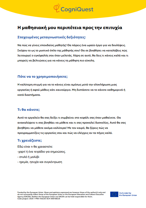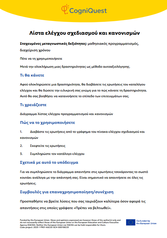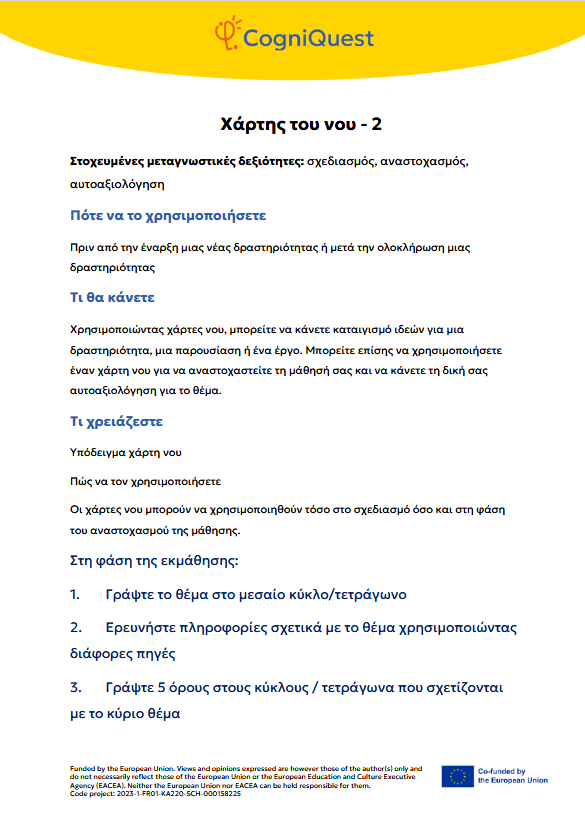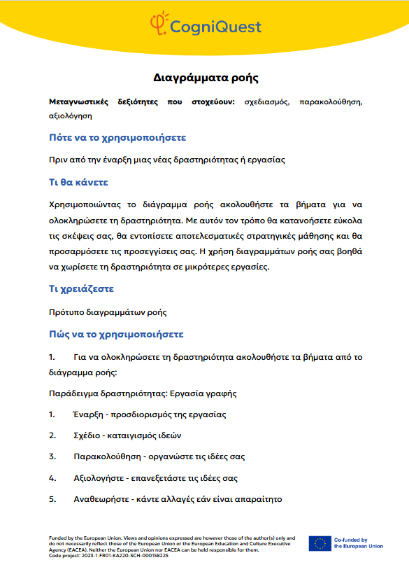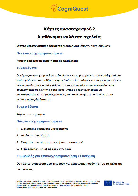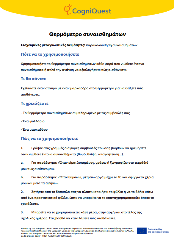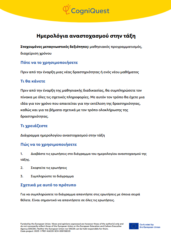 Εφάρμοσε Το σούπερ μυαλό μου – Πώς να το ενισχύσω;Το κεφάλι μου σκέφτεται! – Πώς μαθαίνω και τι με βοηθάει;Πίνακας KWL – Τι ξέρω, τι θέλω να μάθω, τι έμαθαΚάρτες μεταγνωστικού αναστοχασμούΒαρόμετρο προσοχήςΟ ιχνηλάτης των συναισθημάτων μουΤροχός μεταγνώσηςΤο νέο μου σχέδιο συνήθειας σκέψηςΦύλλο καθορισμού στόχων για παιδιάΡουμπρίκα ελέγχου ορθογραφίαςΟμαδική εργασία ΕρευνητώνΕρευνητές Λόγου!Ο βοηθός μου στον διάλογοΕννοιολογικός ΧάρτηςΗ μαθησιακή μου περιπέτεια προς την επιτυχίαΟ ΣΟΥΠΕΡ ΤΡΟΧΟΣ ΣΚΕΨΗΣΗμερολόγια αναστοχασμού στην τάξηΛίστα ελέγχου σχεδιασμού και κανονισμώνΔημιουργική ΓραφήΘερμόμετρο συναισθημάτωνΧάρτης κινήτρωνΠαιχνίδι ρόλωνΞεκινήστε με ένα όνειροΤα έξι καπέλα της σκέψηςΔιαγράμματα ροήςΧάρτης του νου – 2ΚόμικΦωτεινοί σηματοδότεςΜοντέλο καθορισμού στόχων GROWΚάρτες αναστοχασμού 2 – Αισθάνομαι καλά στο σχολείο;