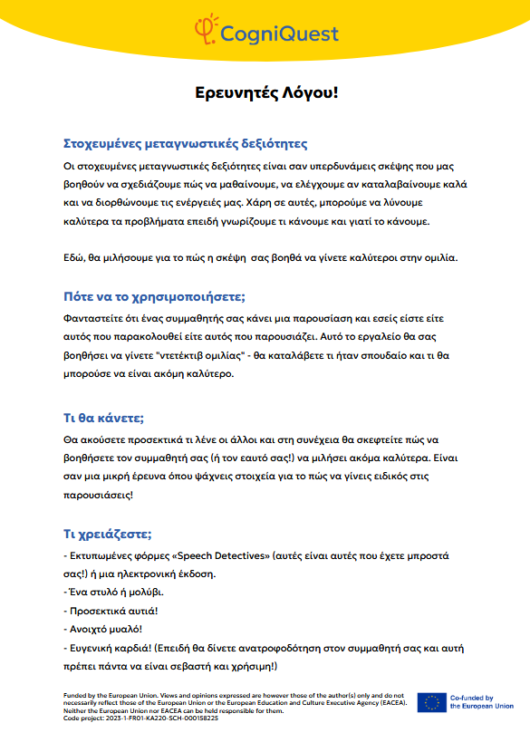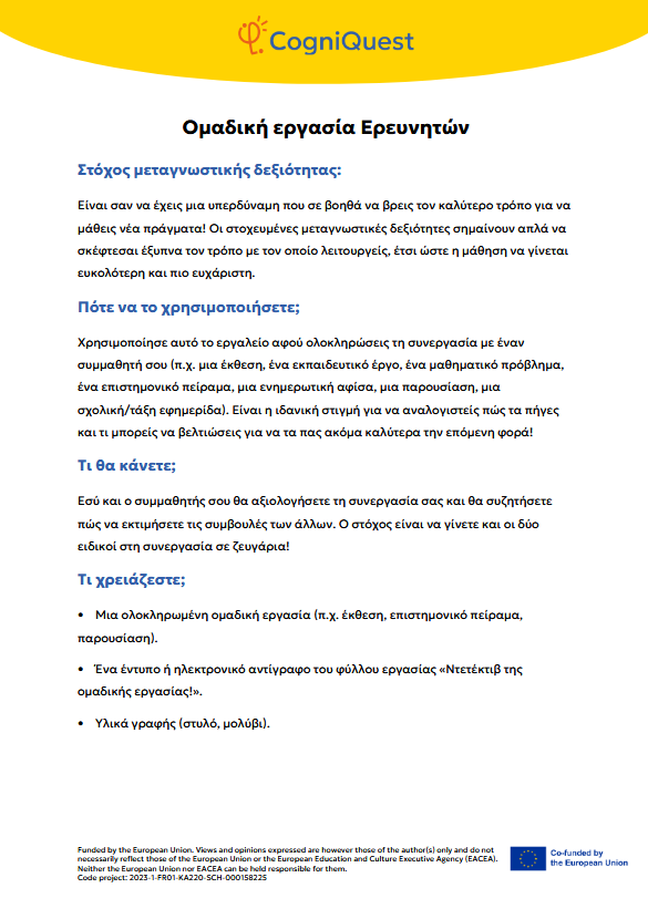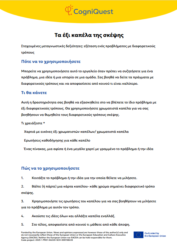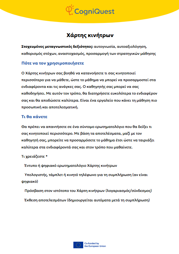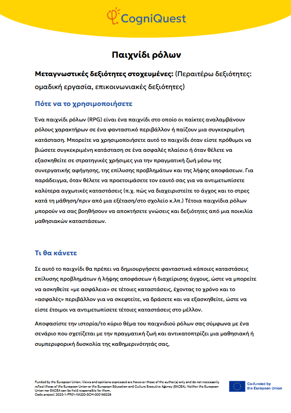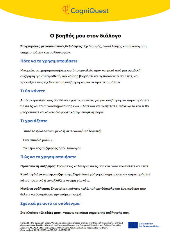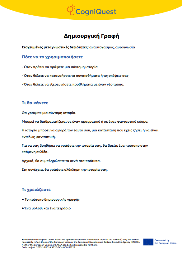 Εφάρμοσε Το σούπερ μυαλό μου – Πώς να το ενισχύσω;Το κεφάλι μου σκέφτεται! – Πώς μαθαίνω και τι με βοηθάει;Πίνακας KWL – Τι ξέρω, τι θέλω να μάθω, τι έμαθαΚάρτες μεταγνωστικού αναστοχασμούΒαρόμετρο προσοχήςΟ ιχνηλάτης των συναισθημάτων μουΤροχός μεταγνώσηςΤο νέο μου σχέδιο συνήθειας σκέψηςΦύλλο καθορισμού στόχων για παιδιάΡουμπρίκα ελέγχου ορθογραφίαςΟμαδική εργασία ΕρευνητώνΕρευνητές Λόγου!Ο βοηθός μου στον διάλογοΕννοιολογικός ΧάρτηςΗ μαθησιακή μου περιπέτεια προς την επιτυχίαΟ ΣΟΥΠΕΡ ΤΡΟΧΟΣ ΣΚΕΨΗΣΗμερολόγια αναστοχασμού στην τάξηΛίστα ελέγχου σχεδιασμού και κανονισμώνΔημιουργική ΓραφήΘερμόμετρο συναισθημάτωνΧάρτης κινήτρωνΠαιχνίδι ρόλωνΞεκινήστε με ένα όνειροΤα έξι καπέλα της σκέψηςΔιαγράμματα ροήςΧάρτης του νου – 2ΚόμικΦωτεινοί σηματοδότεςΜοντέλο καθορισμού στόχων GROWΚάρτες αναστοχασμού 2 – Αισθάνομαι καλά στο σχολείο;