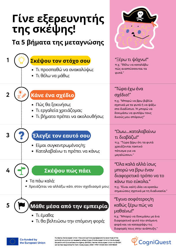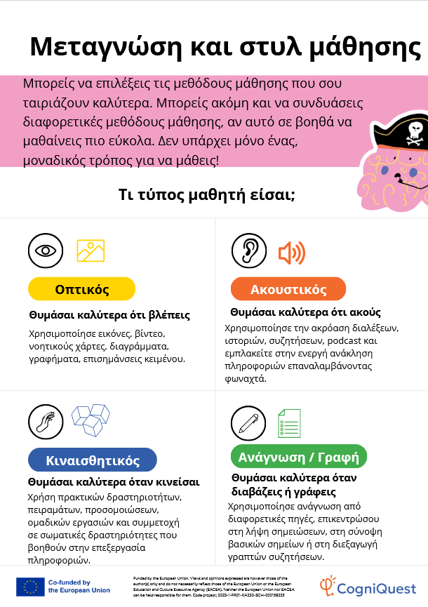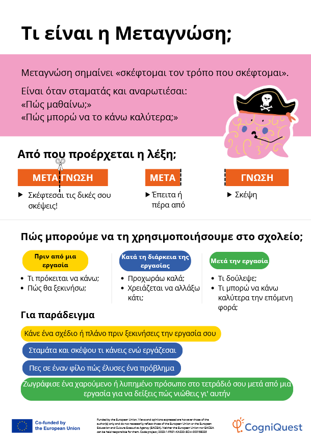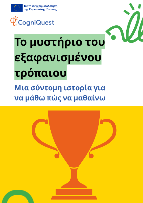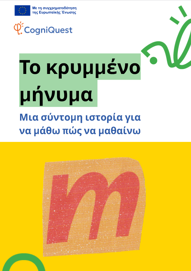 Explore Short stories for learning to learn Τα φτερά του ΙκάρουΤο κάλεσμα των ΣειρήνωνΤο μυστικό κλειδίΟ γρίφος του χαμένου κλειδιούΤο μυστήριο του εξαφανισμένου τρόπαιουΟ μυστηριώδης χάρτηςΟ λαβύρινθος των αναμνήσεωνΤο κρυμμένο μήνυμαΗ Άρπα της ΑλήθειαςΟ καθρέφτης του Μορφέα All stories Think Τι είναι η Μεταγνώση;Τα μυστικά της σκέψης και της μάθησής σουΓίνε εξερευνητής της σκέψης!Μεταγνώση και στυλ μάθησης Card game Practise Thinking about my thinking! – Exit TicketMy Thinking Map: How Do I Learn Best?Plan & Write: Your Powerful Text StrategyThe Muddiest PointTraffic light thinking: Pause / Think / AnswerThe SCAN strategyThe Feynman techniqueQuiz to know myself a bit moreASCQ strategyLocal and Global revision on a written text All exercises