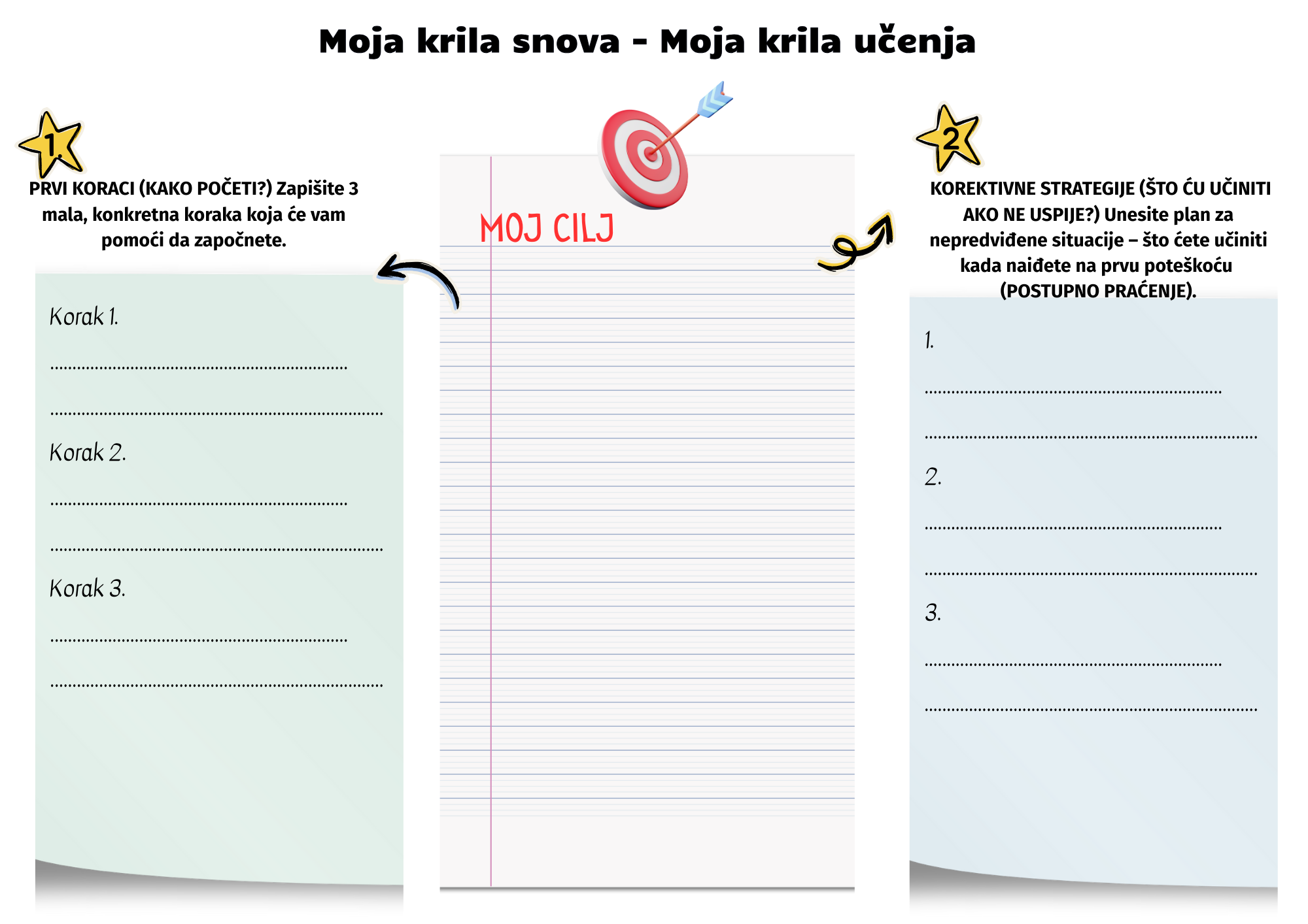 - Napišu ili nacrtaju jedan konkretan cilj u sredinu stranice – vještinu koju žele naučiti (npr. pamćenje pjesme, vježbanje množenja, učenje sviranja gitare, svladavanje novog engleskog vokabulara, učenje rolanja).