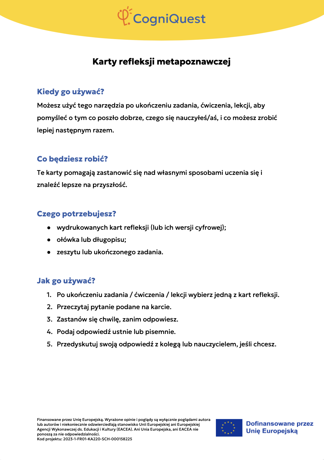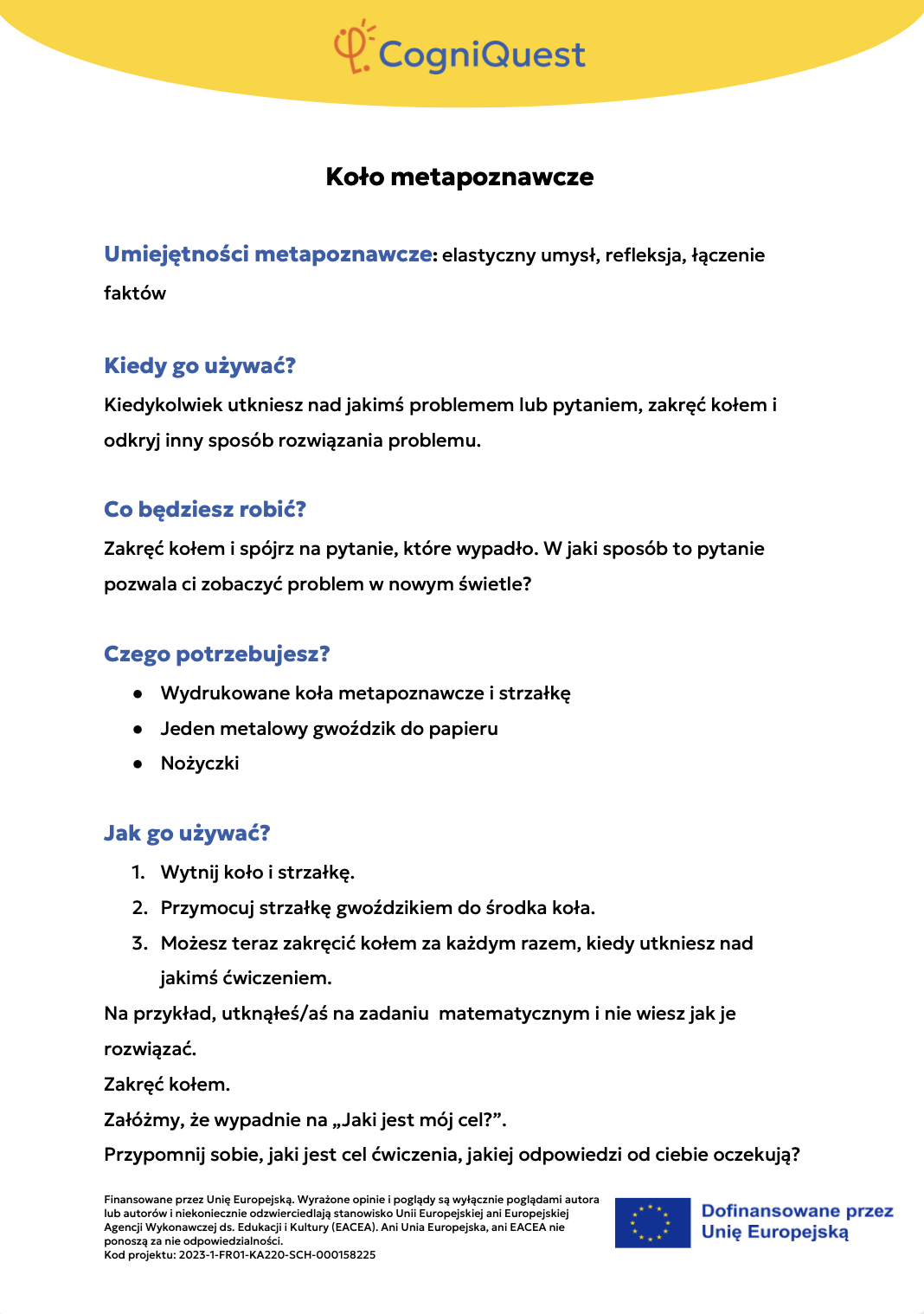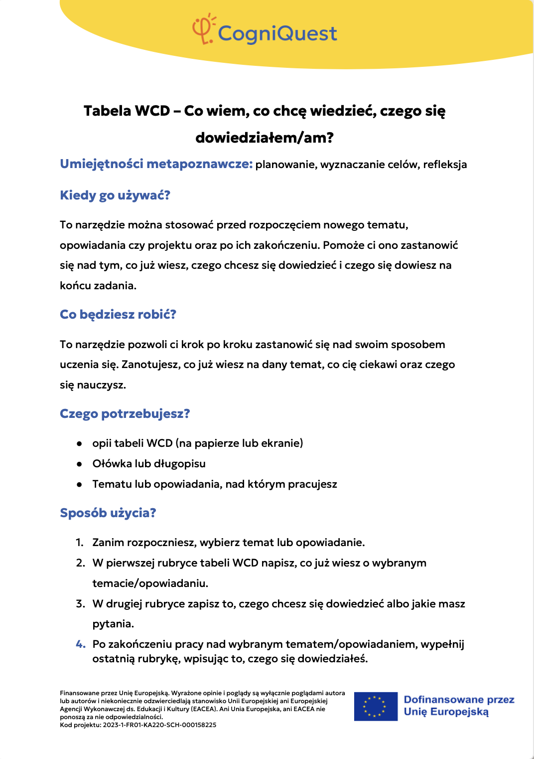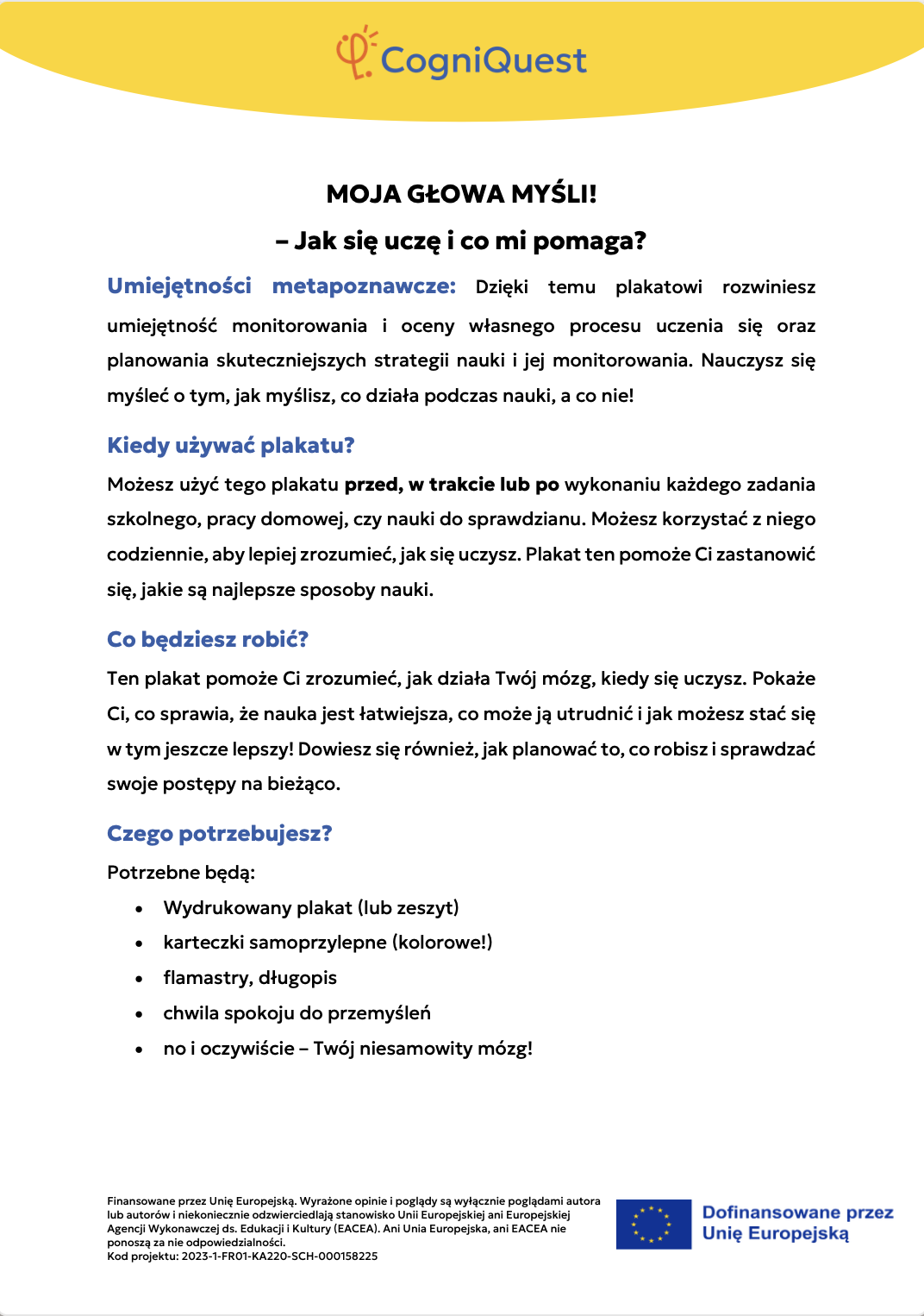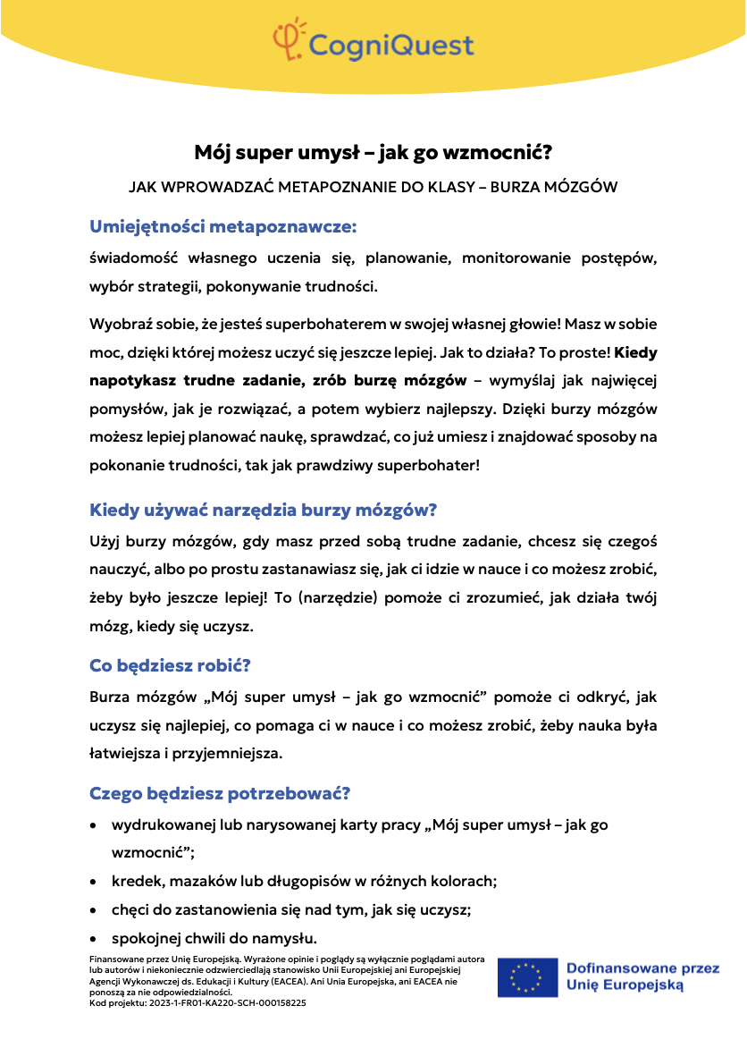 Przeglądaj Krótkie opowiadania do nauki Skrzydła IkaraSyreni ŚpiewSekretny KluczZagadka zaginionego kluczaTajemnica znikającego trofeumTajemnicza mapaLabirynt wspomnieńUkryta wiadomośćHarfa PrawdyZwierciadło Morfeusza Wszystkie historie Pomyśl Czym jest metapoznanie?Sekrety twojego myślenia i naukiZostań odkrywcą myśli!Metapoznanie oraz style uczenia się Gra karciana Zastosuj Myślę o moim myśleniu! – Bilet wyjściaMapa mojego myślenia: Jak uczę się najlepiej?PLANUJ & PISZ: Twoja superstrategia pisania tekstuZagadka zamglonego umysłuMyślenie jak sygnalizacja świetlna – Zatrzymaj się / Pomyśl / DziałajStrategia SCANTechnika FeynmanaQuiz – Poznaj siebie trochę lepiejStrategia ASCQLokalna i globalna korekta tekstu pisanego Wszystkie ćwiczenia Wdróż Mój super umysł – jak go wzmocnić?MOJA GŁOWA MYŚLI! – Jak się uczę i co mi pomaga?Tabela WCD – Co wiem, co chcę wiedzieć, czego się dowiedziałem/am?Karty refleksji metapoznawczejWskaźnik uwagiBarometr emocjiKoło metapoznawczeMój plan nowych nawyków myśleniaArkusz wyznaczania celówLista kontrolna poprawnej pisowni Wszystkie narzędzia