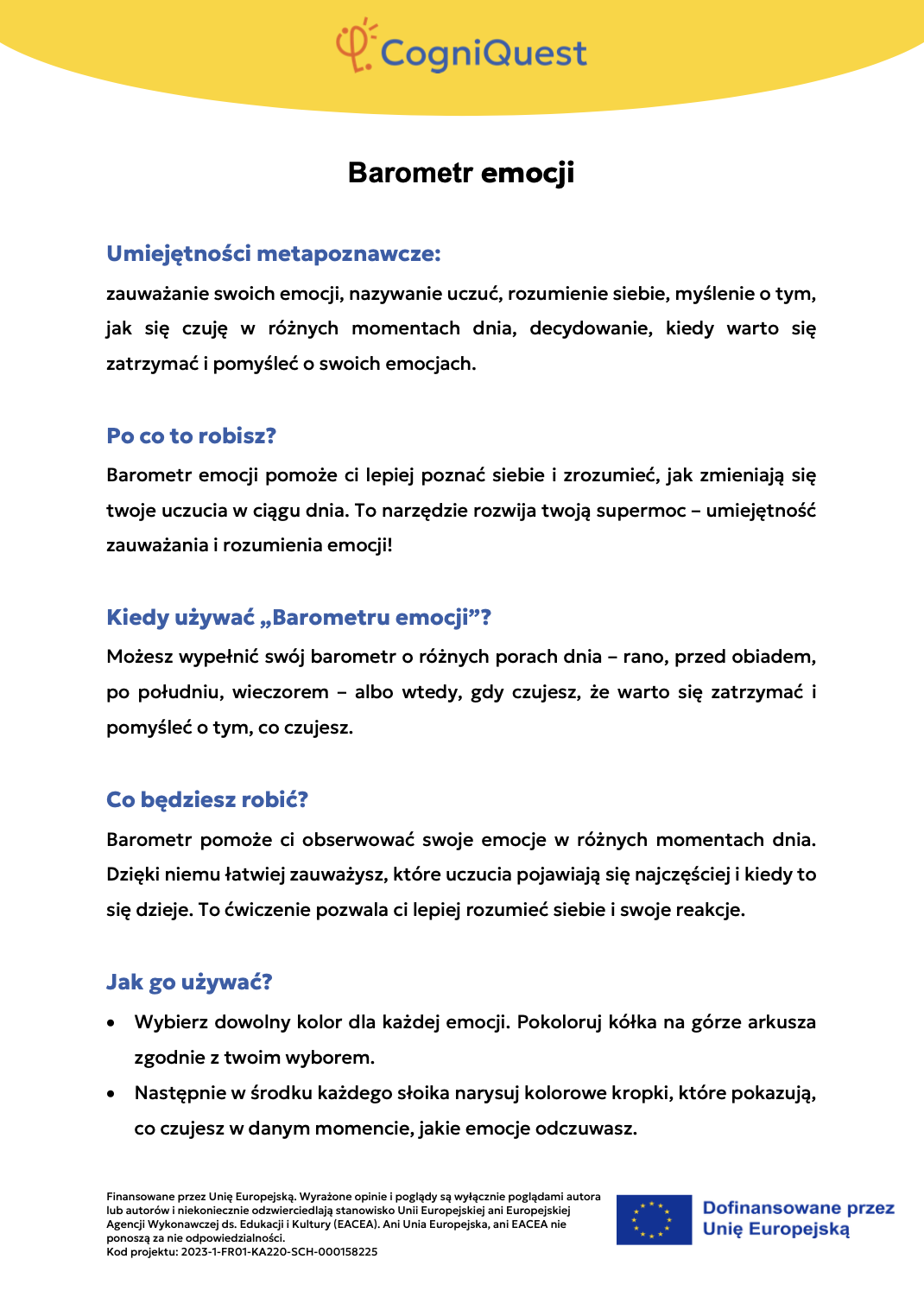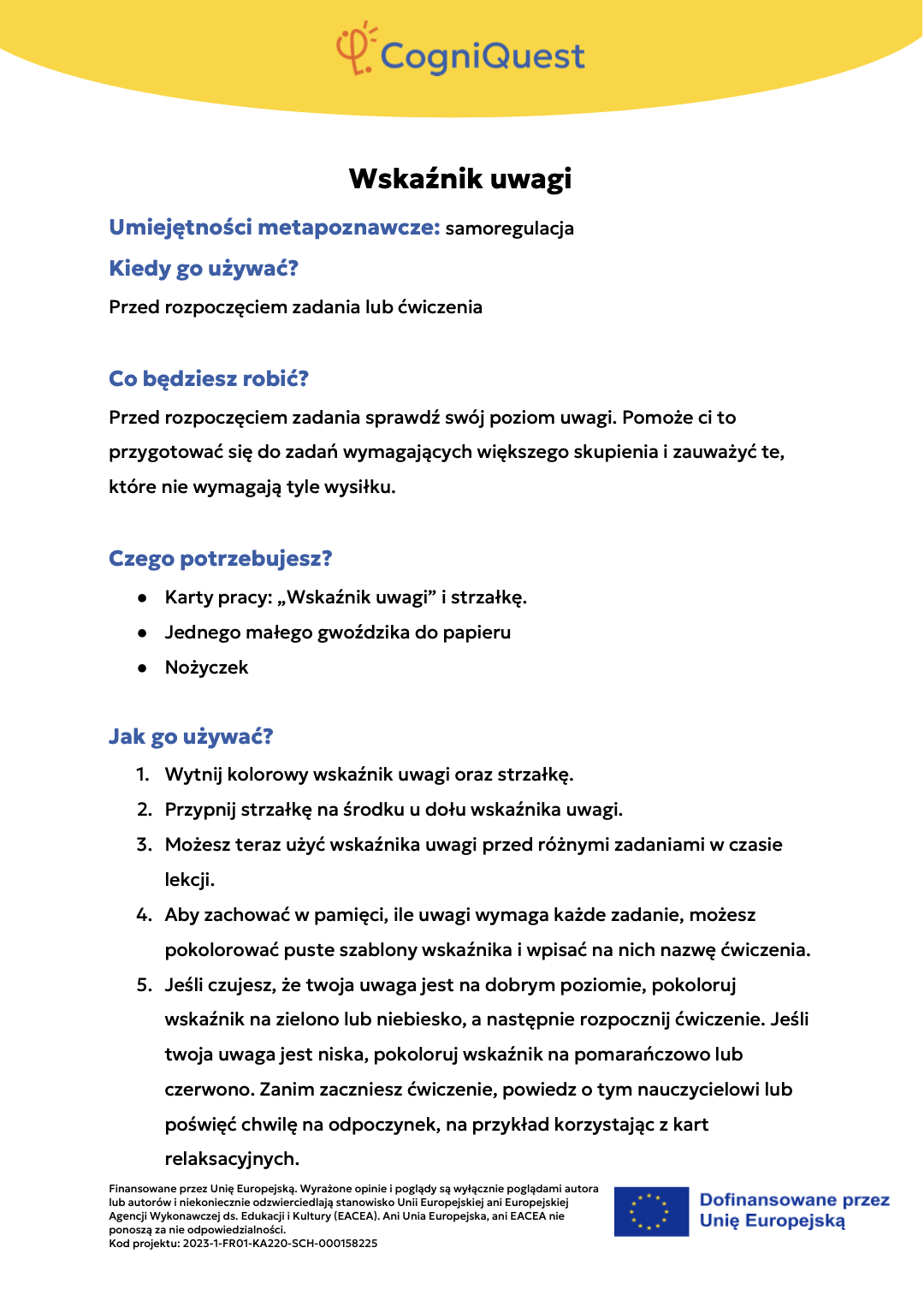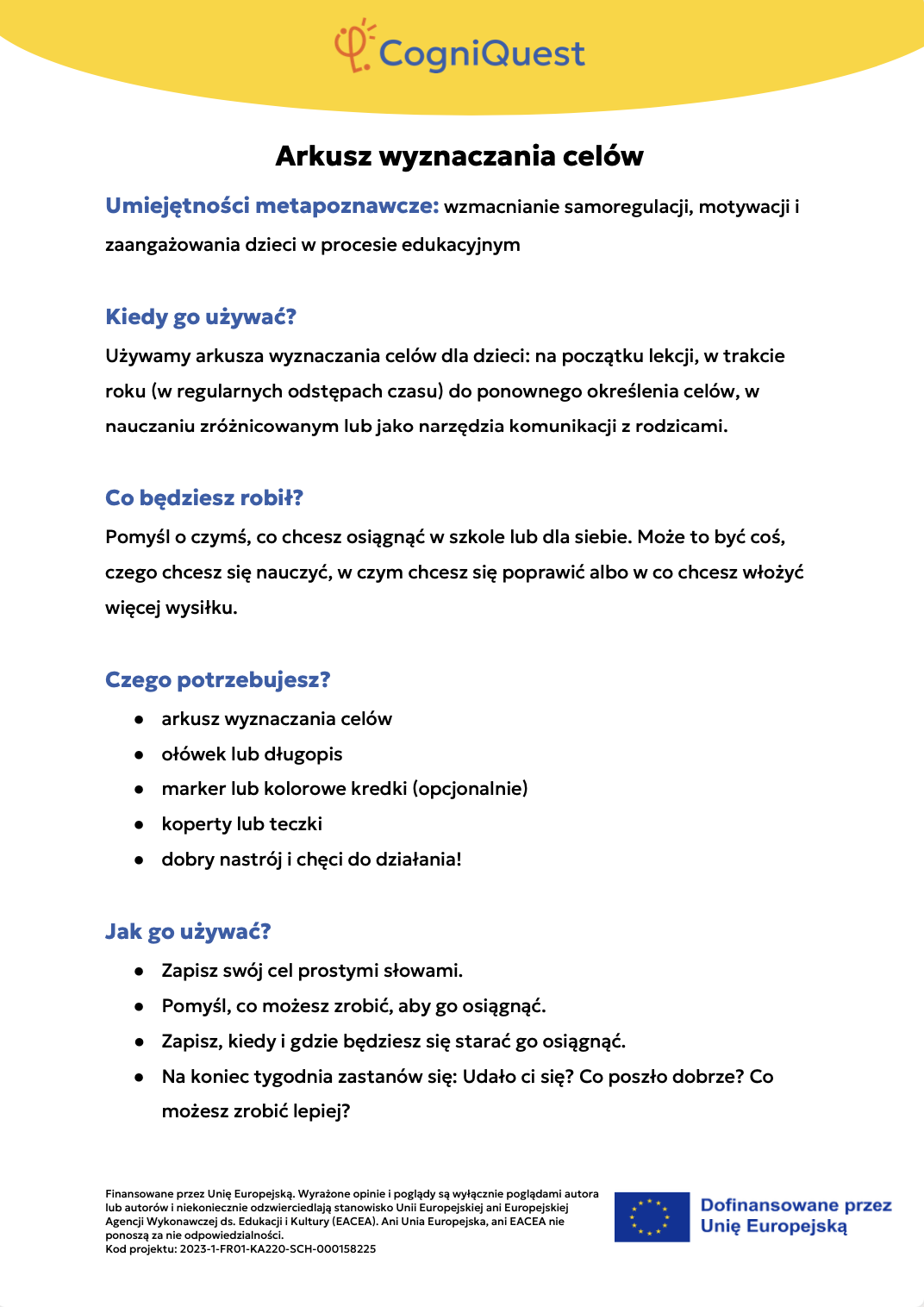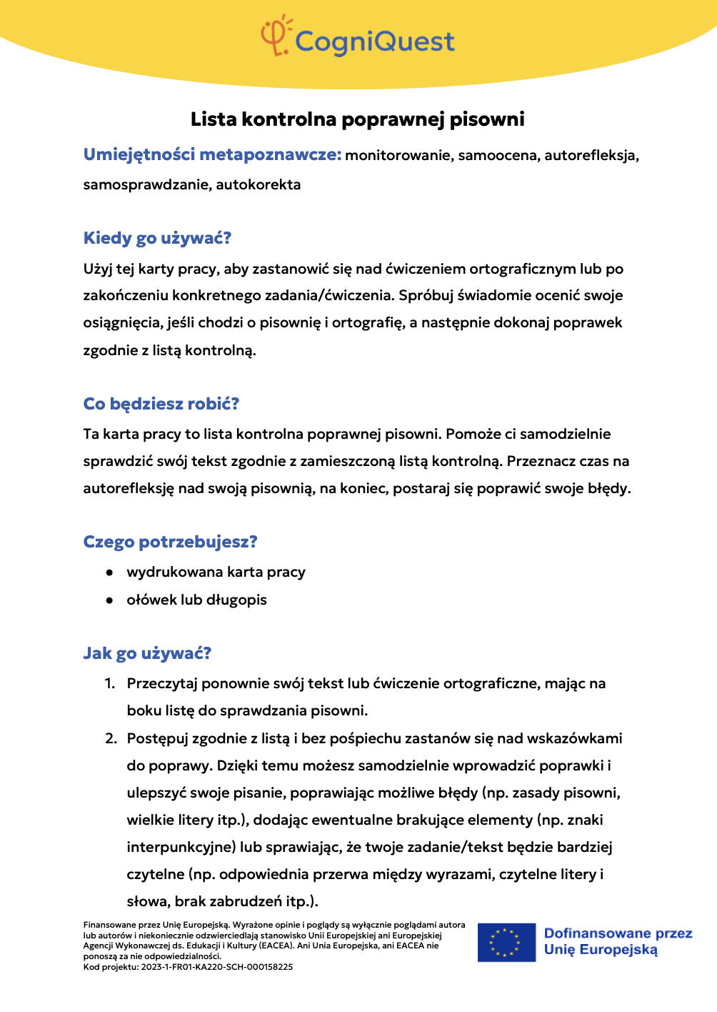 Przeglądaj Krótkie opowiadania do nauki Skrzydła IkaraSyreni ŚpiewSekretny KluczZagadka zaginionego kluczaTajemnica znikającego trofeumTajemnicza mapaLabirynt wspomnieńUkryta wiadomośćHarfa PrawdyZwierciadło Morfeusza Wszystkie historie Pomyśl Czym jest metapoznanie?Sekrety twojego myślenia i naukiZostań odkrywcą myśli!Metapoznanie oraz style uczenia się Gra karciana Zastosuj Myślę o moim myśleniu! – Bilet wyjściaMapa mojego myślenia: Jak uczę się najlepiej?PLANUJ & PISZ: Twoja superstrategia pisania tekstuZagadka zamglonego umysłuMyślenie jak sygnalizacja świetlna – Zatrzymaj się / Pomyśl / DziałajStrategia SCANTechnika FeynmanaQuiz – Poznaj siebie trochę lepiejStrategia ASCQLokalna i globalna korekta tekstu pisanego Wszystkie ćwiczenia Wdróż Mój super umysł – jak go wzmocnić?MOJA GŁOWA MYŚLI! – Jak się uczę i co mi pomaga?Tabela WCD – Co wiem, co chcę wiedzieć, czego się dowiedziałem/am?Karty refleksji metapoznawczejWskaźnik uwagiBarometr emocjiKoło metapoznawczeMój plan nowych nawyków myśleniaArkusz wyznaczania celówLista kontrolna poprawnej pisowni Wszystkie narzędzia