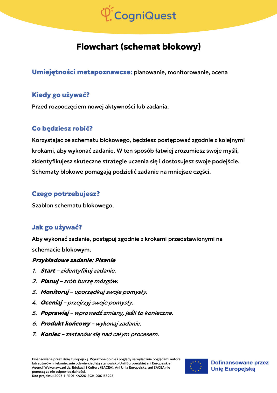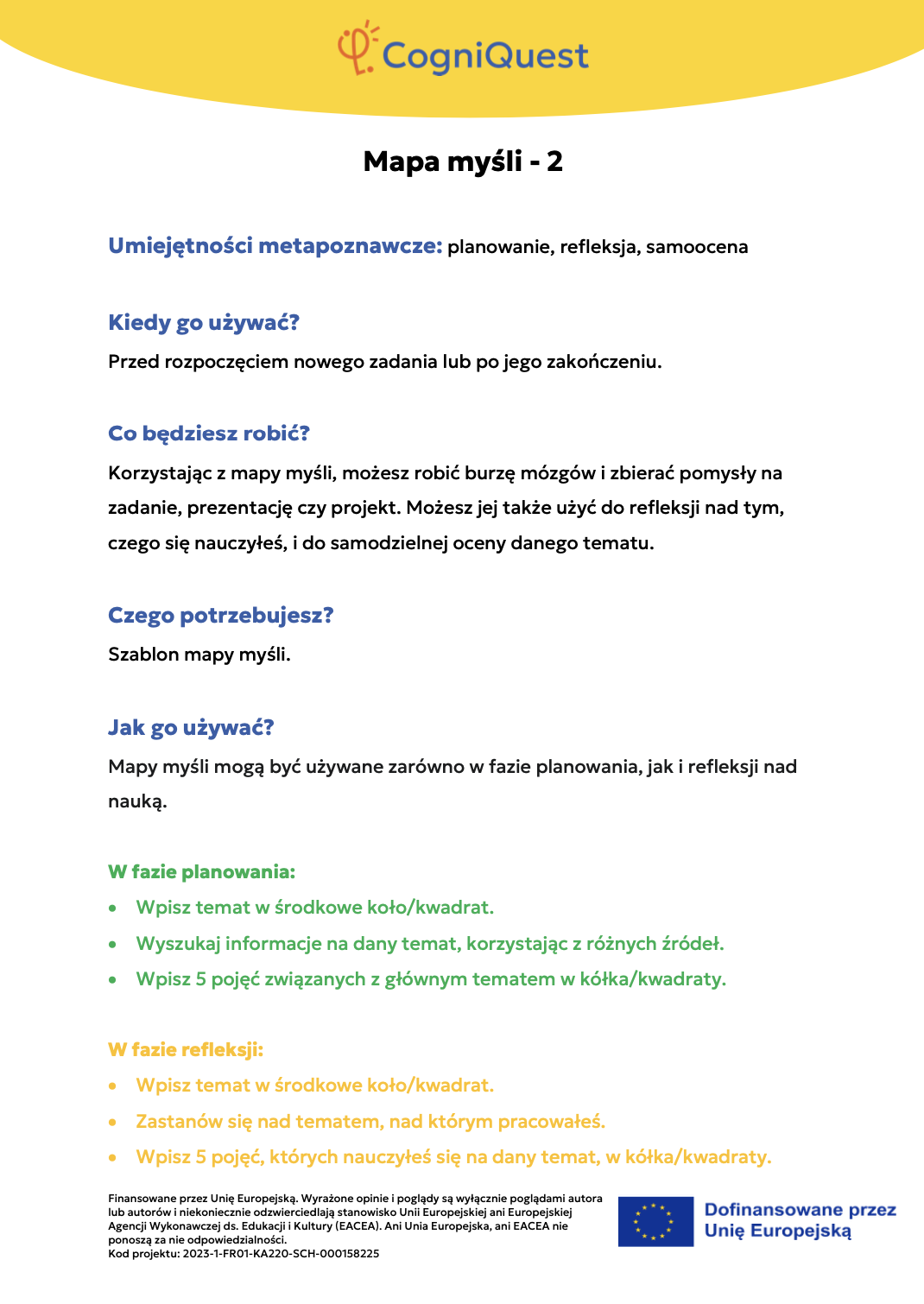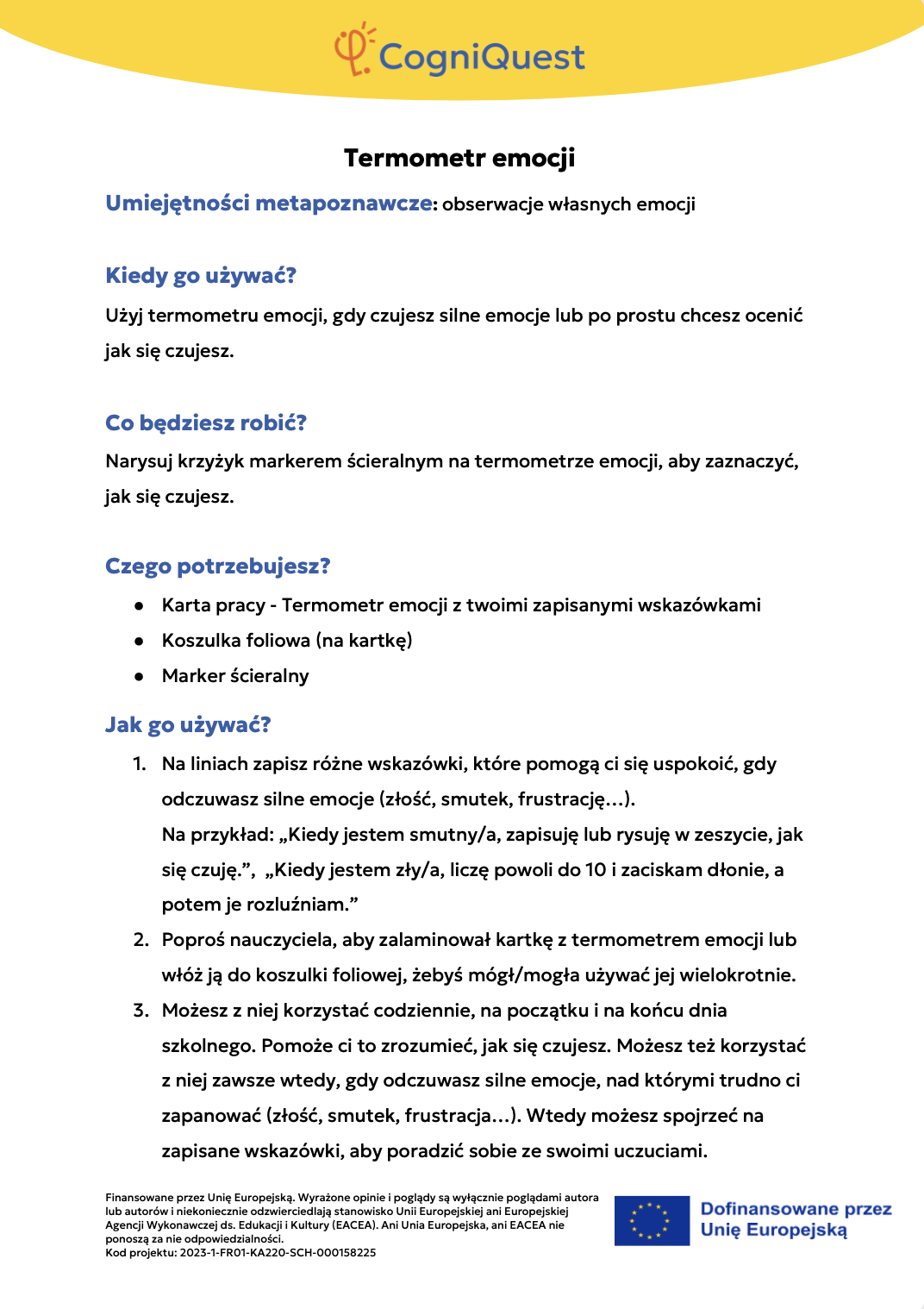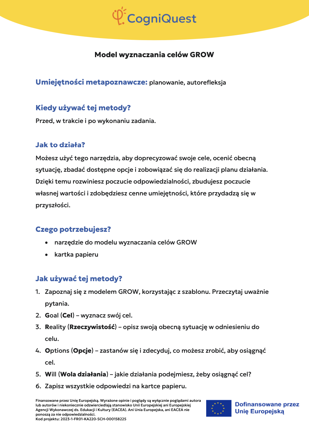 Wdróż Mój super umysł – jak go wzmocnić?MOJA GŁOWA MYŚLI! – Jak się uczę i co mi pomaga?Tabela WCD – Co wiem, co chcę wiedzieć, czego się dowiedziałem/am?Karty refleksji metapoznawczejWskaźnik uwagiBarometr emocjiKoło metapoznawczeMój plan nowych nawyków myśleniaArkusz wyznaczania celówLista kontrolna poprawnej pisowniDetektywi Wypowiedzi!Detektywi Współpracy!Mapa myśliMój pomocnik w debatachMOJA DROGA DO SUKCESU W NAUCEKOŁO SUPER MYŚLENIADziennik lekcyjnej refleksjiLista kontrolna planowania i samoregulacjiTwórcze pisanieTermometr emocjiMapa motywacyjnaGra fabularnaSześć kapeluszy myślowychZacznij od marzeniaFlowchart (schemat blokowy)Mapa myśli – 2KomiksSygnalizacja świetlnaModel wyznaczania celów GROWKarty do refleksji 2 – Czy czuję się dobrze w szkole?