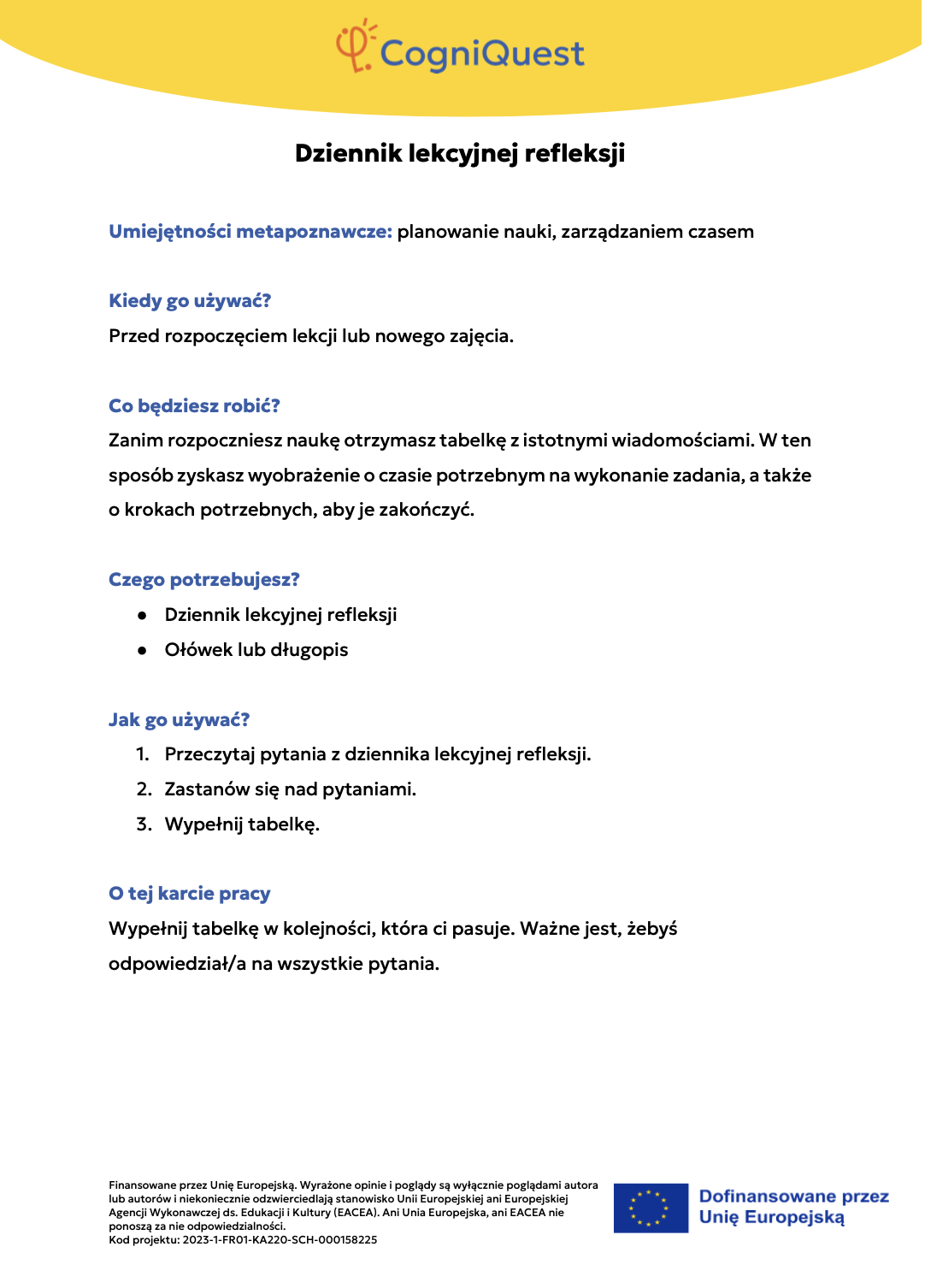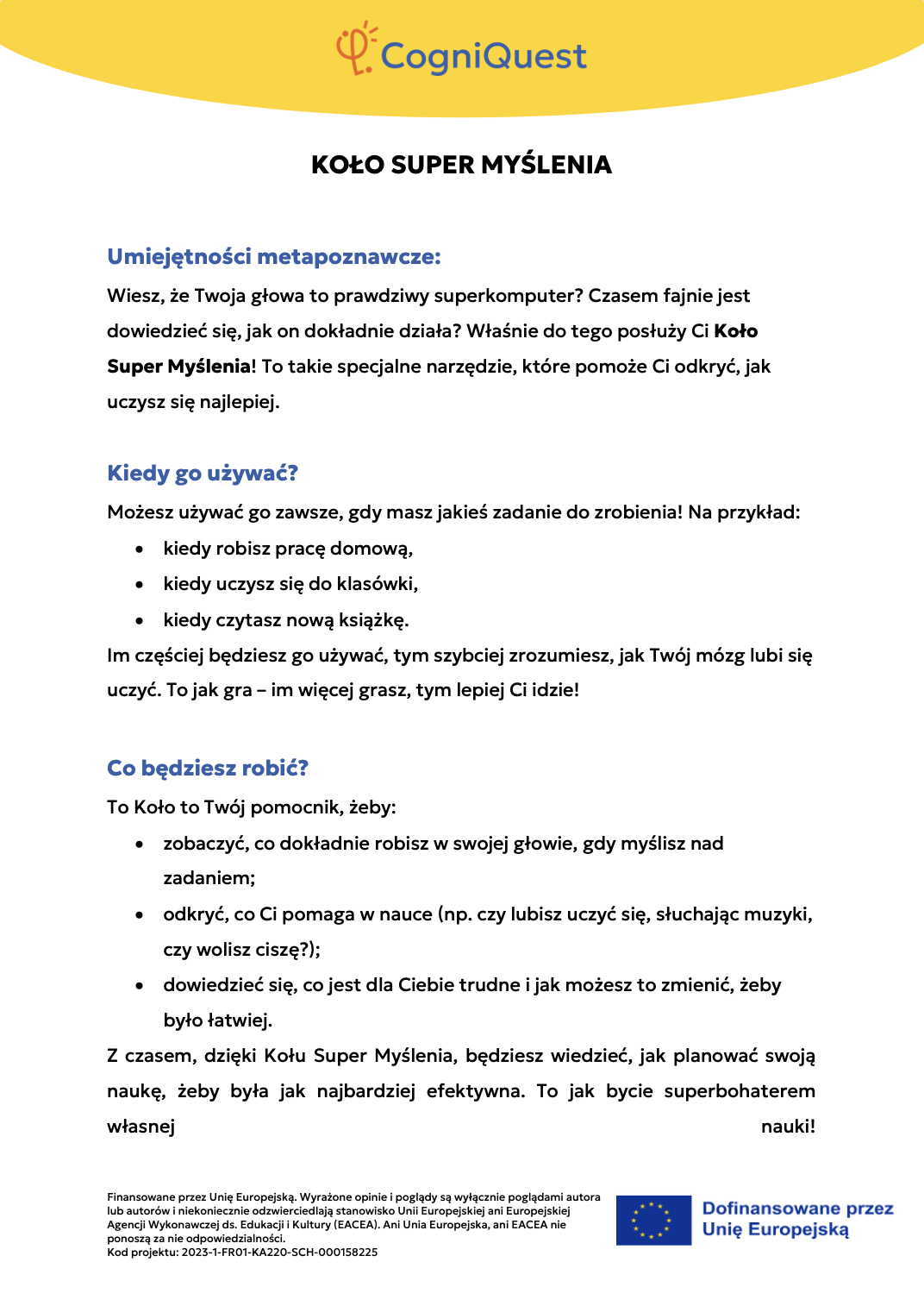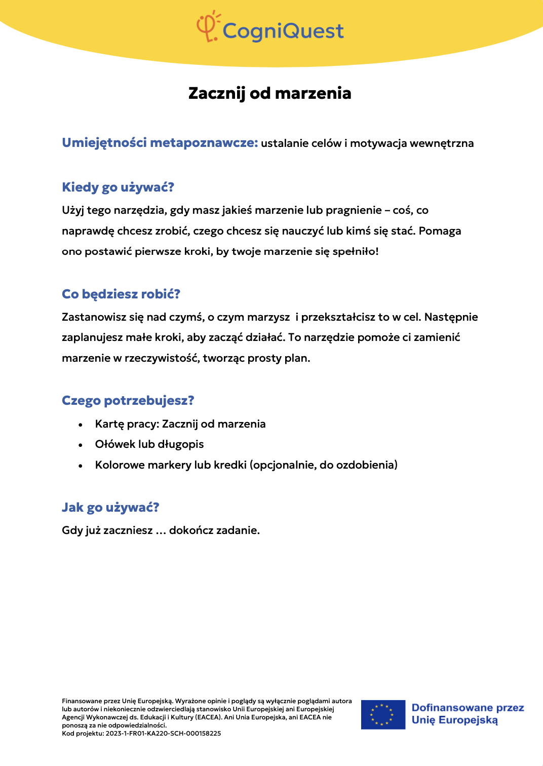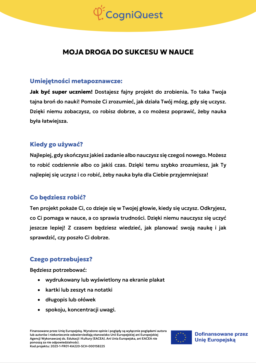 Wdróż Mój super umysł – jak go wzmocnić?MOJA GŁOWA MYŚLI! – Jak się uczę i co mi pomaga?Tabela WCD – Co wiem, co chcę wiedzieć, czego się dowiedziałem/am?Karty refleksji metapoznawczejWskaźnik uwagiBarometr emocjiKoło metapoznawczeMój plan nowych nawyków myśleniaArkusz wyznaczania celówLista kontrolna poprawnej pisowniDetektywi Wypowiedzi!Detektywi Współpracy!Mapa myśliMój pomocnik w debatachMOJA DROGA DO SUKCESU W NAUCEKOŁO SUPER MYŚLENIADziennik lekcyjnej refleksjiLista kontrolna planowania i samoregulacjiTwórcze pisanieTermometr emocjiMapa motywacyjnaGra fabularnaSześć kapeluszy myślowychZacznij od marzeniaFlowchart (schemat blokowy)Mapa myśli – 2KomiksSygnalizacja świetlnaModel wyznaczania celów GROWKarty do refleksji 2 – Czy czuję się dobrze w szkole?
