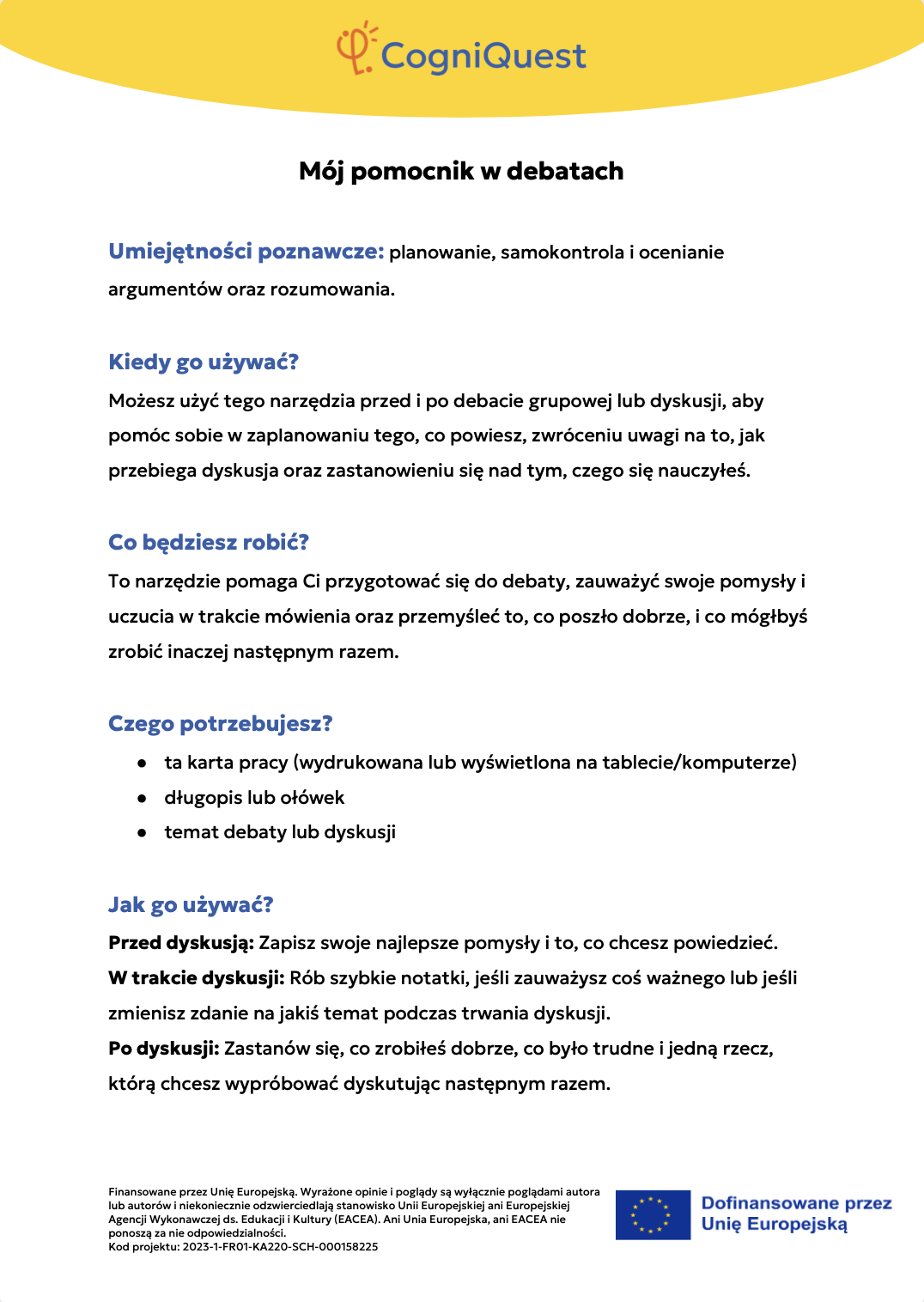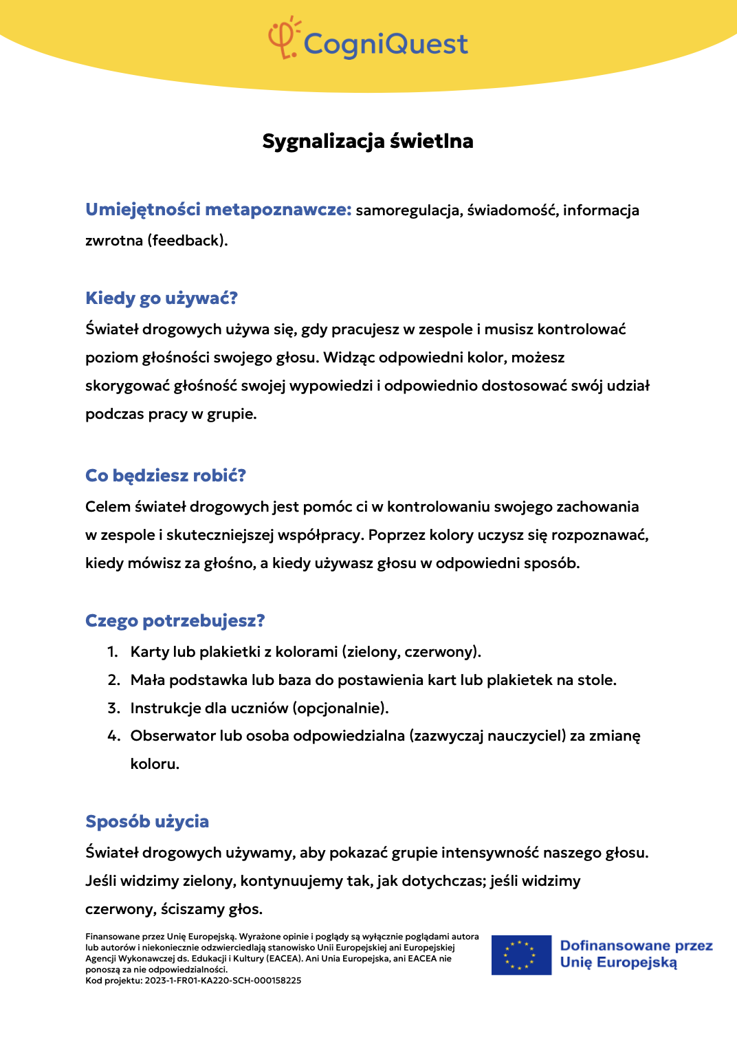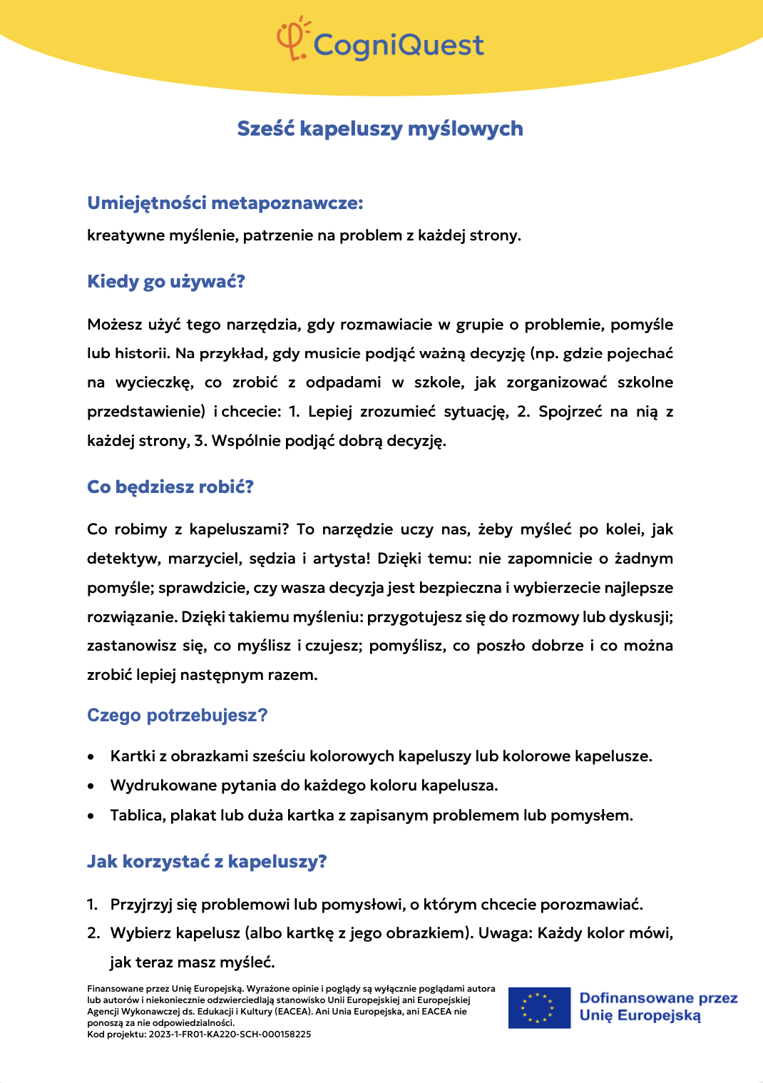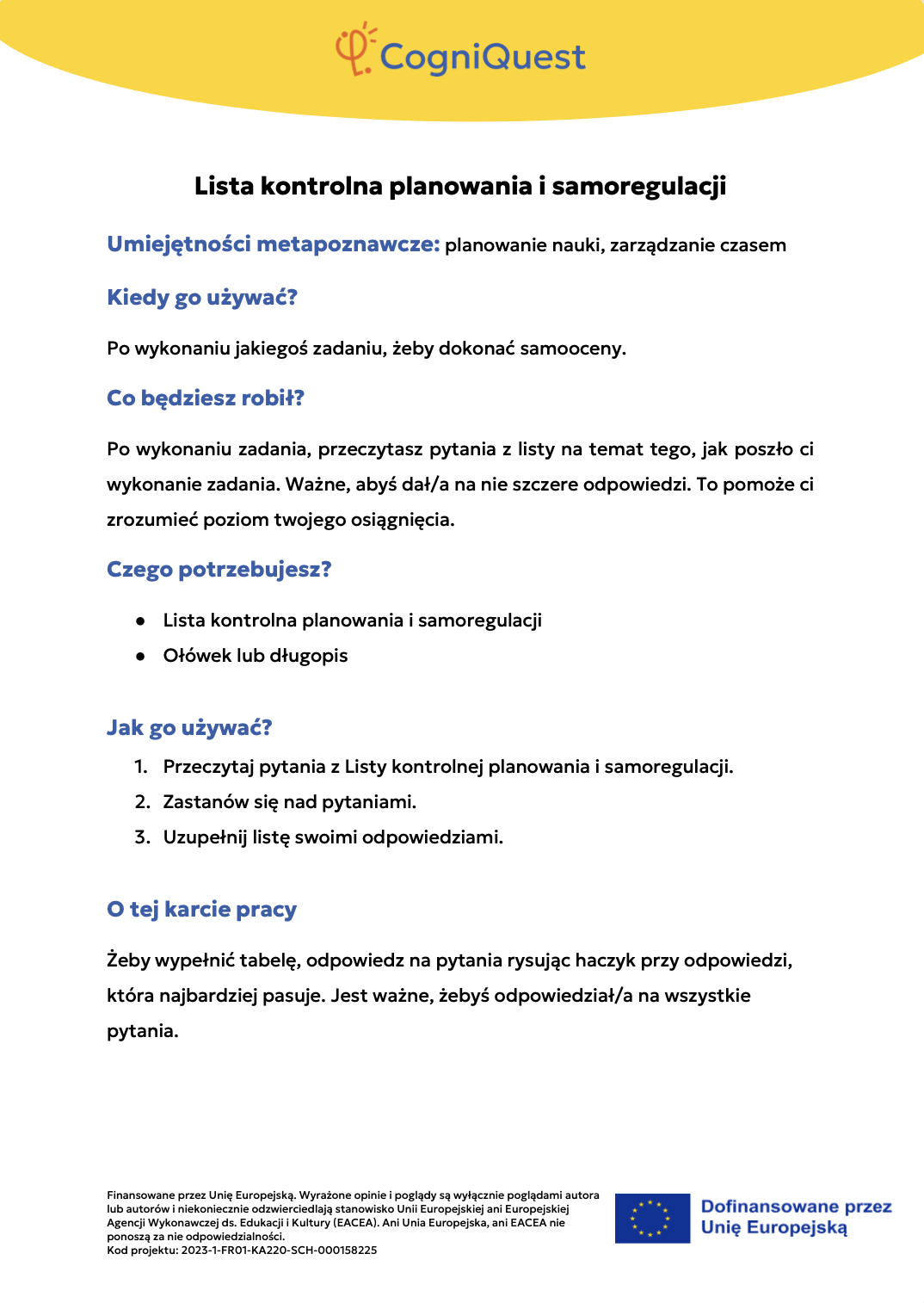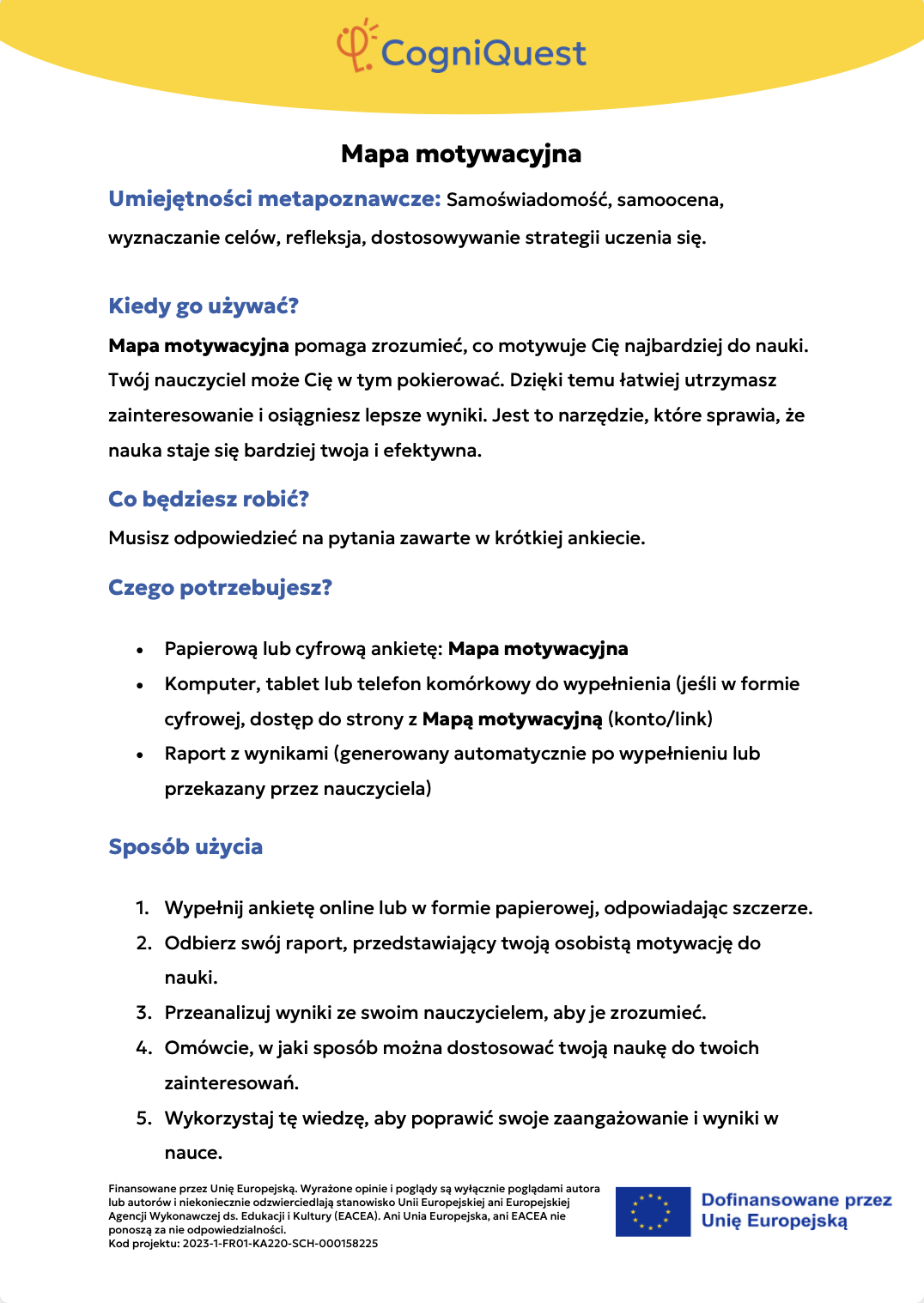 Wdróż Mój super umysł – jak go wzmocnić?MOJA GŁOWA MYŚLI! – Jak się uczę i co mi pomaga?Tabela WCD – Co wiem, co chcę wiedzieć, czego się dowiedziałem/am?Karty refleksji metapoznawczejWskaźnik uwagiBarometr emocjiKoło metapoznawczeMój plan nowych nawyków myśleniaArkusz wyznaczania celówLista kontrolna poprawnej pisowniDetektywi Wypowiedzi!Detektywi Współpracy!Mapa myśliMój pomocnik w debatachMOJA DROGA DO SUKCESU W NAUCEKOŁO SUPER MYŚLENIADziennik lekcyjnej refleksjiLista kontrolna planowania i samoregulacjiTwórcze pisanieTermometr emocjiMapa motywacyjnaGra fabularnaSześć kapeluszy myślowychZacznij od marzeniaFlowchart (schemat blokowy)Mapa myśli – 2KomiksSygnalizacja świetlnaModel wyznaczania celów GROWKarty do refleksji 2 – Czy czuję się dobrze w szkole?