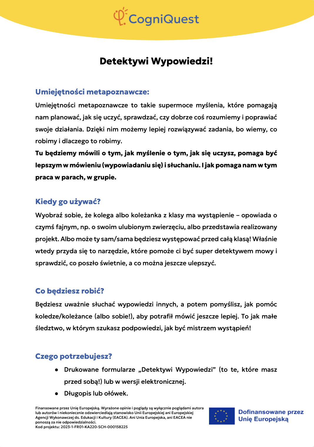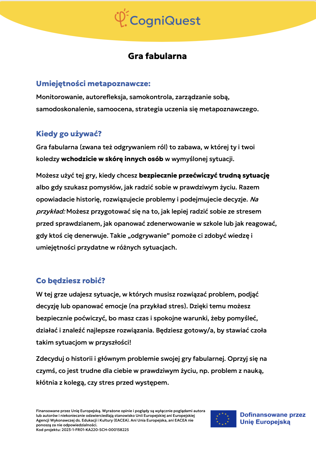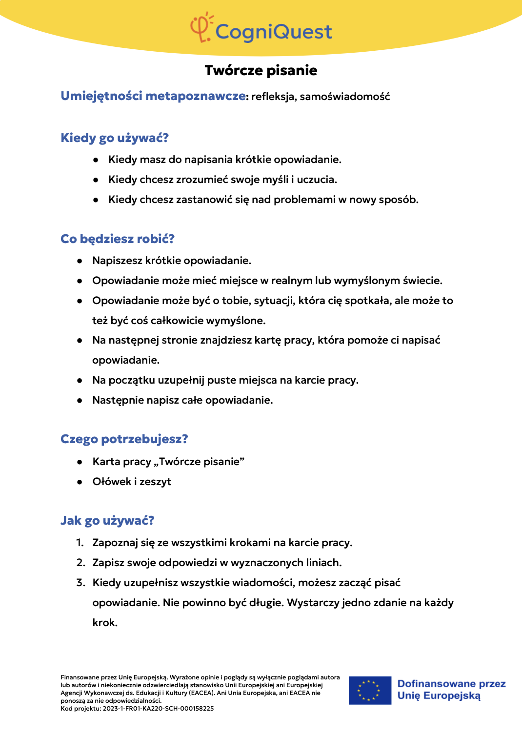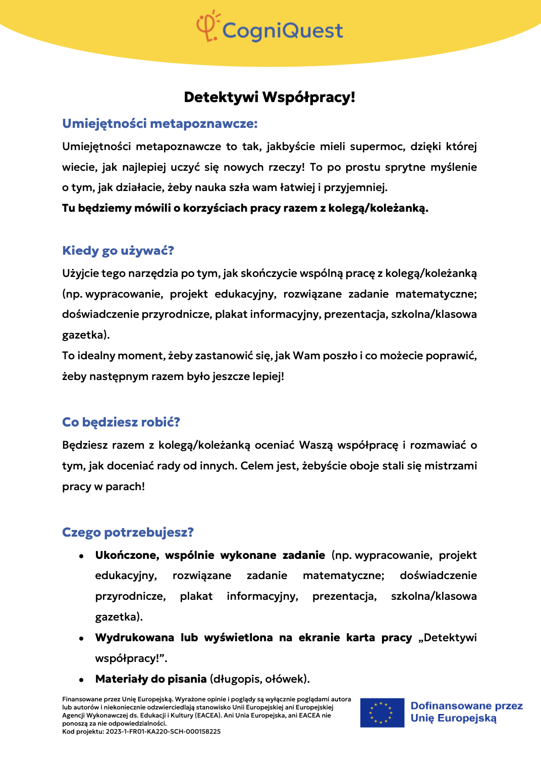 Wdróż Mój super umysł – jak go wzmocnić?MOJA GŁOWA MYŚLI! – Jak się uczę i co mi pomaga?Tabela WCD – Co wiem, co chcę wiedzieć, czego się dowiedziałem/am?Karty refleksji metapoznawczejWskaźnik uwagiBarometr emocjiKoło metapoznawczeMój plan nowych nawyków myśleniaArkusz wyznaczania celówLista kontrolna poprawnej pisowniDetektywi Wypowiedzi!Detektywi Współpracy!Mapa myśliMój pomocnik w debatachMOJA DROGA DO SUKCESU W NAUCEKOŁO SUPER MYŚLENIADziennik lekcyjnej refleksjiLista kontrolna planowania i samoregulacjiTwórcze pisanieTermometr emocjiMapa motywacyjnaGra fabularnaSześć kapeluszy myślowychZacznij od marzeniaFlowchart (schemat blokowy)Mapa myśli – 2KomiksSygnalizacja świetlnaModel wyznaczania celów GROWKarty do refleksji 2 – Czy czuję się dobrze w szkole?